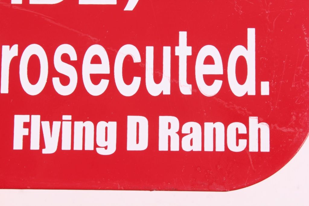 The sign is in great condition and is a rounded edge metal & porcelain sign from Ted Turners ranch, The Flying D Ranch in Big Sky, Montana. The sign would have gone on a fence line where he keeps his famous Buffalo. Measures 9"x12"