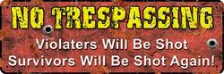 o Trespassing Sign - ViolatersMeasures: Tin sign constructed of 30 gauge steel with rolled edges, rounded corners and a durable weather resistant finish. Includes pre-punched corner screw holes for mounting. Size is 10.5in x 3.5in.