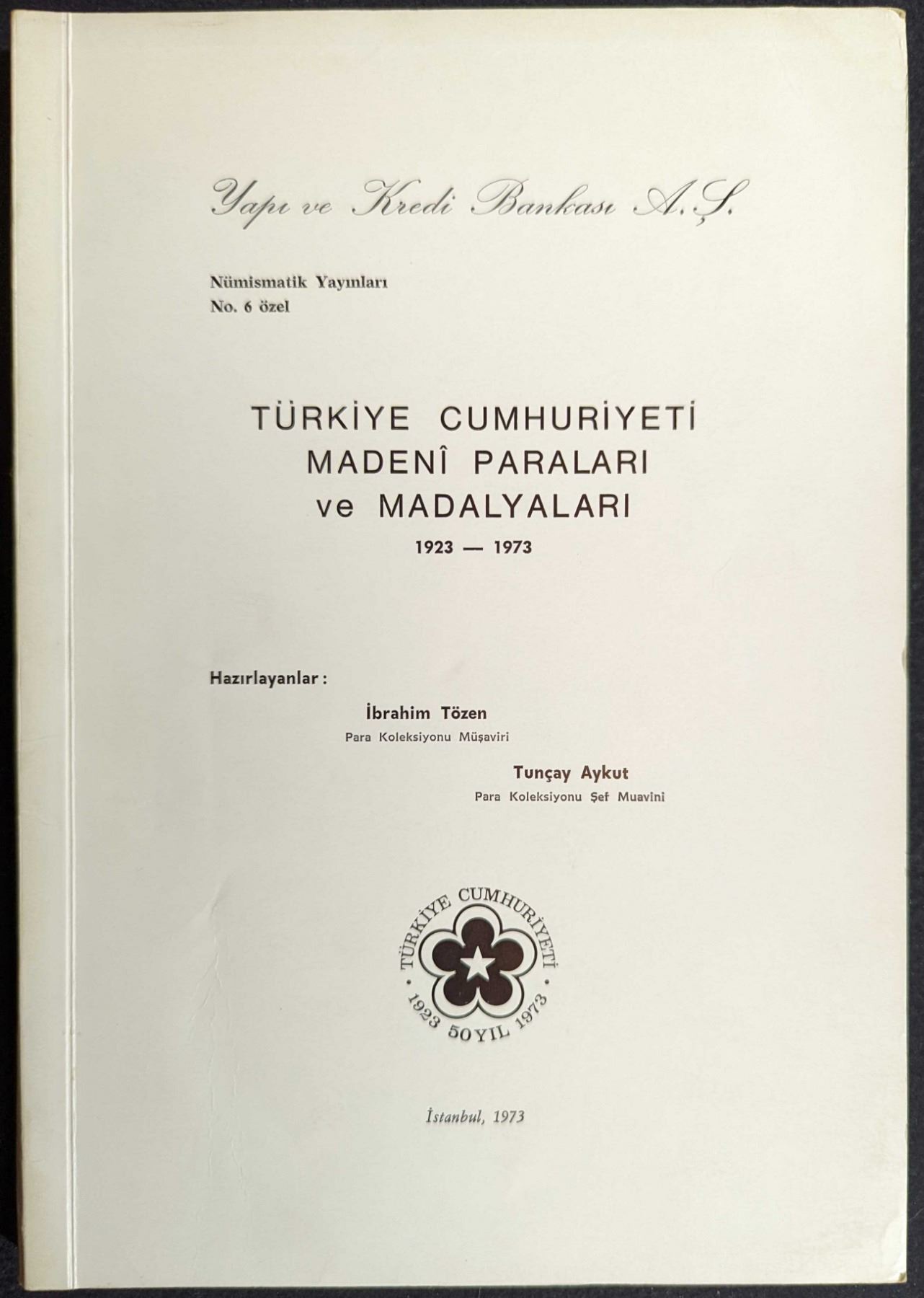 (4) Turkiye Cumhuriyet Madeni Paralari ve Madalyalari 1923-1973 by Ibrahim Tozen and Tun‡ay Aykut. Yap? Kredi Bankasi A.S. 1973. Softcover. 8vo. 87 pages. Illustrated. 22 plates. Fine. Text in Turkish. This book covers some of the coins and medals that have been used in the 50-year period since the foundation of the Republic. Coins, regardless of chronological order, are presented in three sections: gold, silver, and other coins. In addition to these are sections covering commemorative coins and medals.