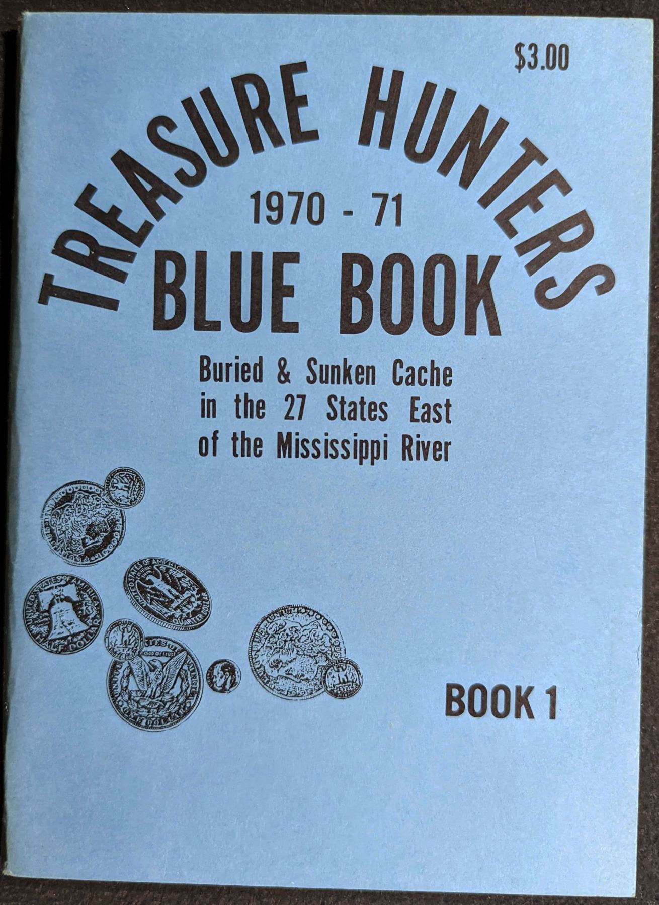 TREASURE HUNTERS BLUE BOOK 1970-71. BOOK 1. Eight States Associates. 1971. 12mo. Non-Paginated pages. First edition. original blue printed card covers. illustrated. Fine. This book is a collection of tales of treasure hoards, treasures found, and sunken treasure and organized according to zone located. Includes a directory of treasure hunters, reference library, and other sources of information. Scarce. Lot weight: 0 lbs 3oz. Subject(s): Buried, Sunken Treasure.