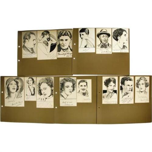 <B>Noah Beery and Others Signed Original Celebrity Sketches.</B></I> A selection of 14 small pen-and-ink sketches of various celebrities from the Golden Age of Hollywood, including Noah Beery, Bessie Love, Elissa Landi, Billie Dove, and others, signed by their respective subjects and affixed to a 11.5" x 9.5" photo album page. The drawings are by artist Robert L. Whittington. In overall Very Fine condition with occasional instances of toning and/or soiling.<BR><BR><b>Shipping:</b> Flat Material, Small (<a target="_blank" href="http://www.heritageauctions.com/common/shipping.php">view shipping information</a>)