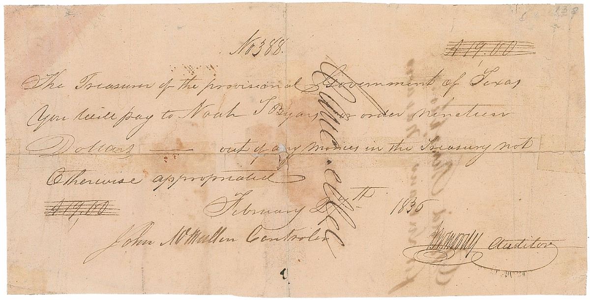 Manuscript document, one page, 7.25 x 3.75, February 27, 1836. A pay order, in part: “The Treasurer of the provisional Government of Texas. You will pay to Noah T. Byars or order nineteen Dollars—out of any monies in the Treasury not otherwise appropriated.” Signed at the conclusion by John McMullen as controller and J. W. Moody as auditor; not signed by Byars. In very good condition, with repaired separations to central vertical and horizontal folds, a couple chips, overall wrinkling, scattered staining, cancellation notations, and show-through from docketing to reverse. Byars owned the building rented for the then-assembled Convention of 1836, which resulted in the Texas Declaration of Independence being signed just three days later on March 2, 1836. Provenance: The Robert Davis Collection.
