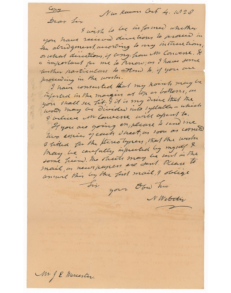 ALS signed “N. Webster,” one page, 7.25 x 12, October 4, 1828. Letter to J. E. Worcester, headed at the top, “Copy.” In full: “I wish to be informed whether you have received directions to proceed in the abridgment, according to my instructions, or what directions, if any, have Mr. Converse. It is important for me to know; as I have some further particulars to attend to, if you are proceeding in the work. I have consented that my points may be inserted in the margin at top or bottom, as you shall see fit; & it is my desire that the word may be divided into syllables—which I believe Mr. Converse will consent to. If you are going on, please to send me two copies of each sheet, as soon as corrected & fitted for the steno typers, that the words may be carefully inspected by myself & some friends. The sheets may be sent in the mail, as newspapers are sent. Please to answer this by the first mail.” In very good condition, with partial separations to edges of horizontal mailing folds, a uniform shade of mild toning, and some light mirroring of ink from folding. Accompanied by a full letter of authenticity from PSA/DNA.