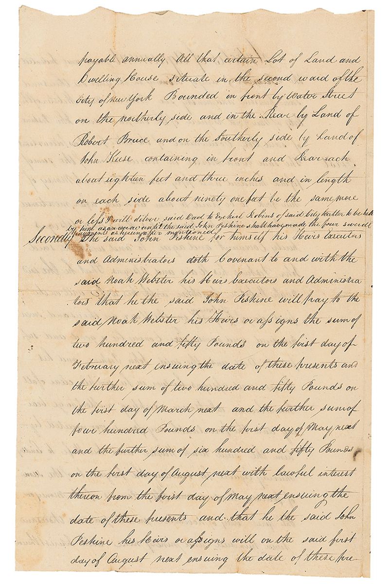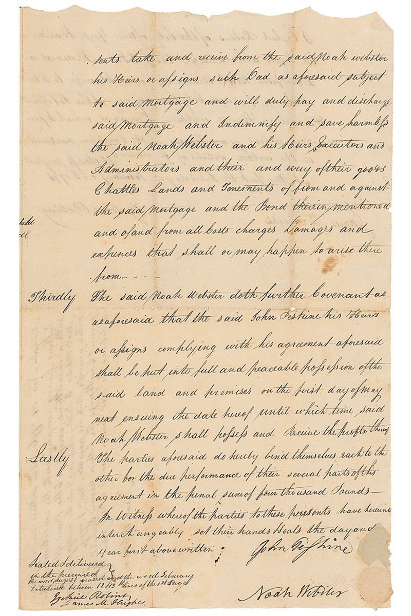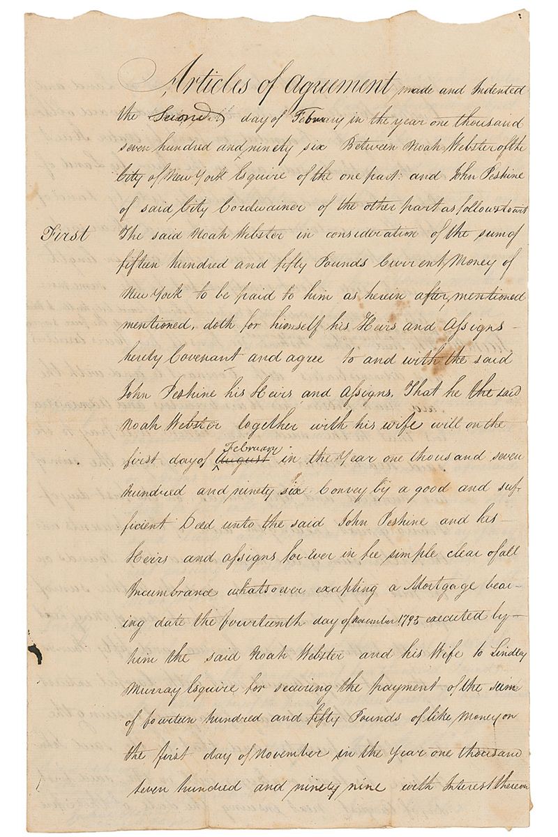 Manuscript DS, three scallop-topped pages on two adjoining sheets, 9 x 14.5, February 2, 1796. In part: “Articles of Agreement…Between Noah Webster of the City of New York Esquire of the one part and John Peshine of said City Cordwainer [shoemaker] of the other part as follows to wit The said Noah Webster in consideration of the sum of fifteen hundred and fifty pounds Current Money of New York to be paid to him…That the said Noah Webster together with his wife will…Convey by a good and sufficient Deed unto the said John Peshine and his Heirs and assigns for-ever in fee simple clear of all Incumbrance whatsoever exception a Mortgage bearing date the fourteenth of November 1795 executed by him the said Noah Webster and his Wife to Lindley Murray Esquire.”