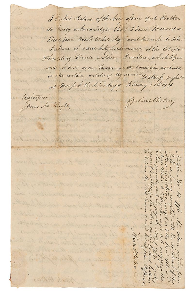 On the reverse of the second page, Webster adds a lengthy handwritten endorsement, signed at the conclusion “Noah Webster,” and signed again in the text, dated November 14, 1796. Webster writes “New York Nov 14 1796. The within named John Peshine, having complied with the conditions of the within indenture, except as to the Bond of the said Noah Webster to Lindley Murray, & also the mortgage on the within premises, which are payable Novr 1, 1799, I hereby permit & authorize the within named Ezekiel Robins to deliver the deed herein named to said John Peshine.” Reverse also bears an endorsement from Ezekiel Robins. In very good condition, with intersecting folds, scattered toning and soiling, some lightly affecting endorsement signature, scattered creases, and some light spotting to text. When attorney Lindley Murray left New York for England in 1795, he sold a property to Noah Webster, then writing for the city’s first daily newspaper, American Minerva, which he founded two years prior. A fellow grammarian, Murray was an admirer of Webster’s earlier works. This document, with such a lengthy excerpt in Webster’s hand and the wonderful connection to a well-known fellow grammarian, is a wonderful addition to any literary collection.