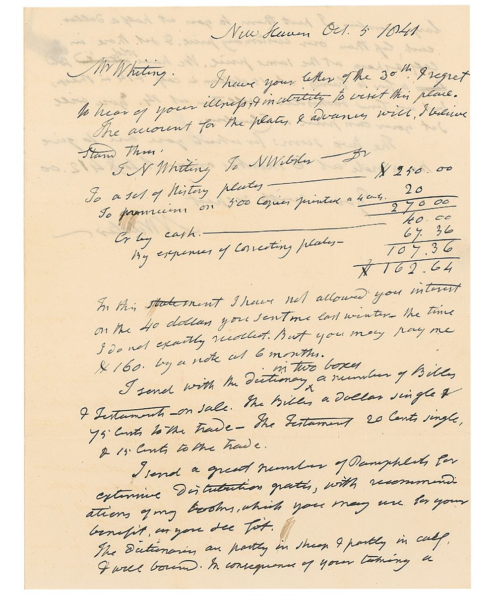 Author and lexicographer (1758–1843) who published the first comprehensive dictionary of American English. ALS signed “N. Webster,” one page both sides, 7.5 x 9.75, October 5, 1841. Handwritten copy of a letter to T. N. Whiting. In part: “I have your letter of the 30th. I regret to hear of your illness & inability to visit this place. The account for the plates & advances will, I believe, stand thus. T. N. Whiting to N. Webster, to a set of plates…to premium on 500 copies printed at 4 cents…my expenses of concocting plates…$162.64. In this statement I have not allowed you interest on the 40 dollars you sent me last winter, the time I do not exactly recollect. But you may pay me $160. By a note at 6 months. I send with the dictionary in two boxes a number of Bibles & Testaments on sale. The Bibles a dollar single & 75 cents to the trade—The Testament 20 cents single, & 15 cents to the trade. I send a great number of Pamphlets for extensive distribution gratis, with recommendations of my books, which you may use for your benefit as you see fit. The dictionaries are partly in sheep & partly in calf & well bound. The consequence of your taking a large number, I put them to you at half a dollar each, less than our customary price & set those in calf & sheep at the same price. We have sold a few to friends at 15 dollars in calf & 14 in sheep, but we find booksellers sell them at 14. You will set your own price in Columbus. The two sums for which you are to give me a note at 6 months amount to $412.00.” On the second integral page, Webster writes out another invoice for $252.00, to “Mr. T. N. Whiting Bot of N. Webster, 25 sets of American Dictionary,” and a second account for the sale of Bibles for $26.10. On the reverse of the second integral page, Webster has docketed the letter, “Copy of a Letter to T. N. Whiting, Columbus Ohio.” In fine condition, with intersecting folds, one through a single letter of letter’s signature, and another passing through a single letter of another signature, and a brush to a single letter of text on second page. Accompanied by a full letter of authenticity from PSA/DNA.