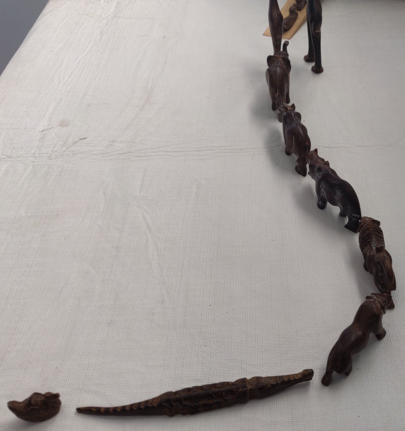 Noah's Ark & Animals, c. 1920s. Made of ironwood, the item measures 13" x 5 1/2" x 3". Seri Indian, Mexico. 13 animals in all. Condition: Some nicks and scratches, see images. Shipping: $30.00 w/insurance and signature, due to value and weight.