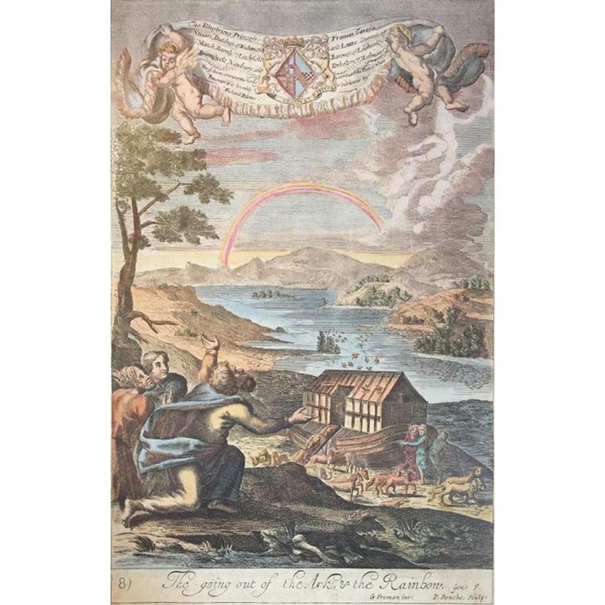 Modern, vintage machine colored print of Noah's Ark. Child's nursery decor print, created after an original antique print entitled, "The going out of the Ark, & the Rainbow." 10 1/2" X 16 1/2". Shrink-wrapped in the original packaging from the 1990's. Ready to be framed