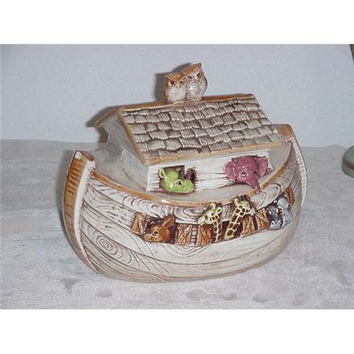 Treasure Craft Co. Compton Ca. " Noah's Ark" cookie jar, 9" tall, 11" wide. Inside lid impressed treasure craft made in USA, with paper label shown.