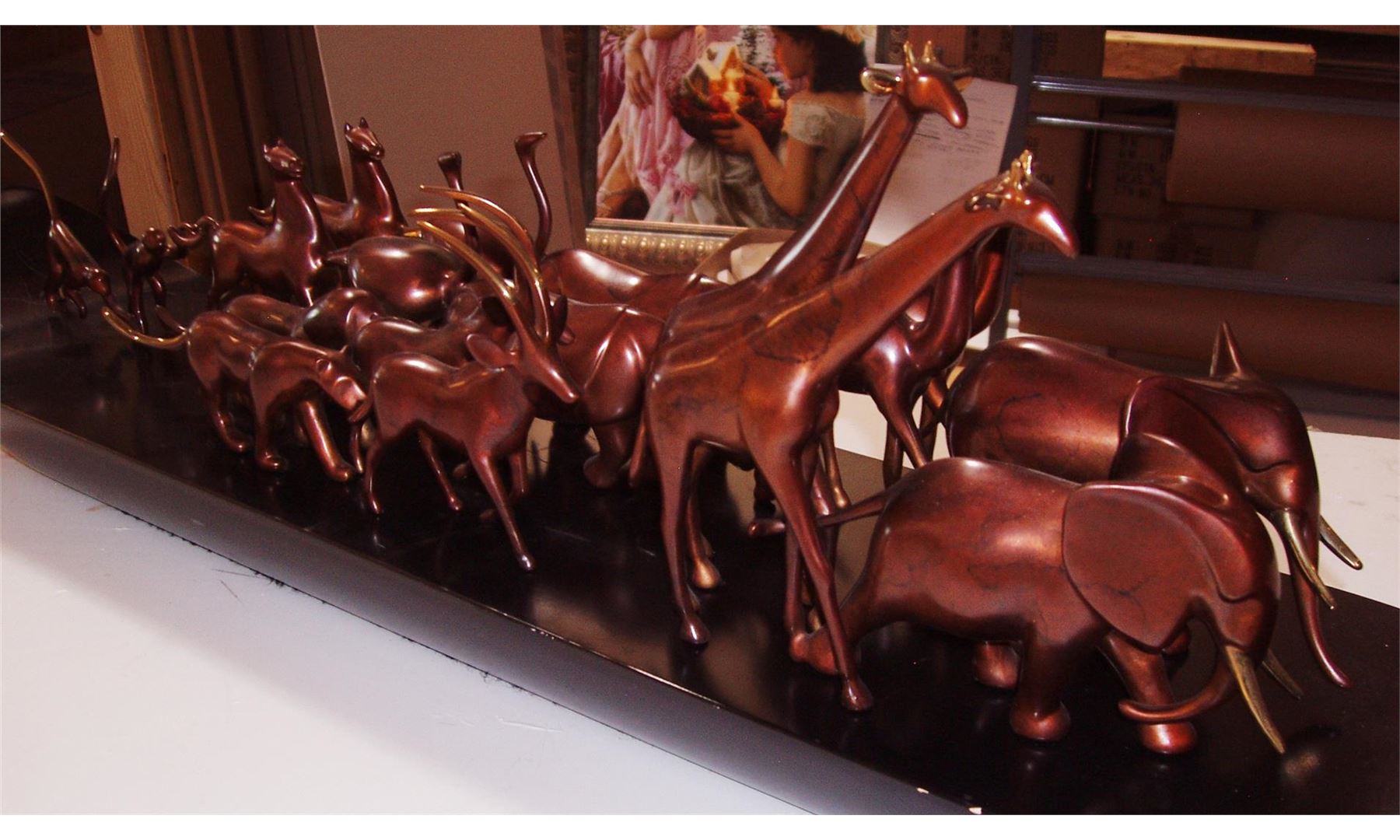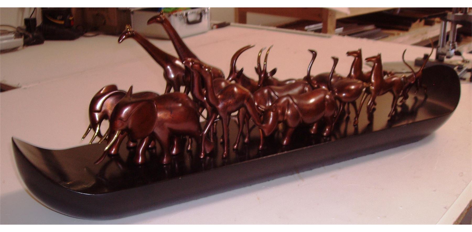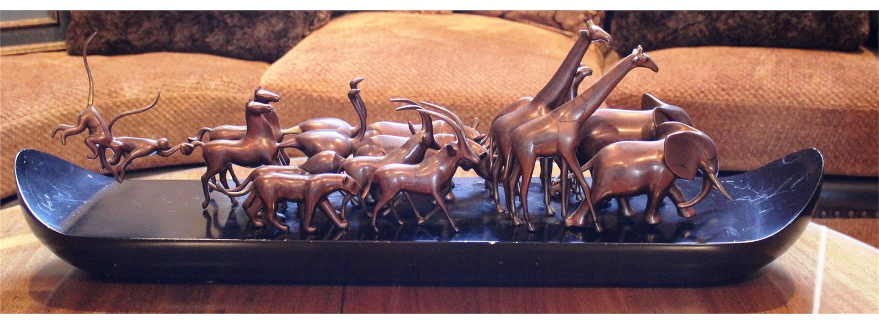 Born in Holland, artist Loet Vanderveen created this high-end bronze sculpture of a selection of animals walking two-by-two into Noah's ark. The sculpture measures 30 x 9 x 8.
