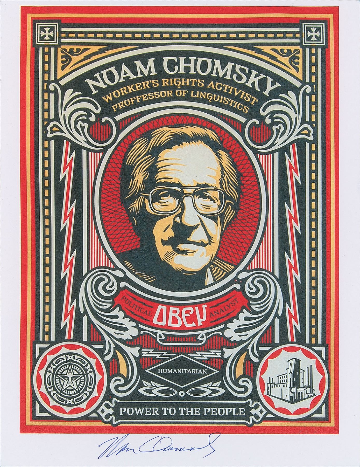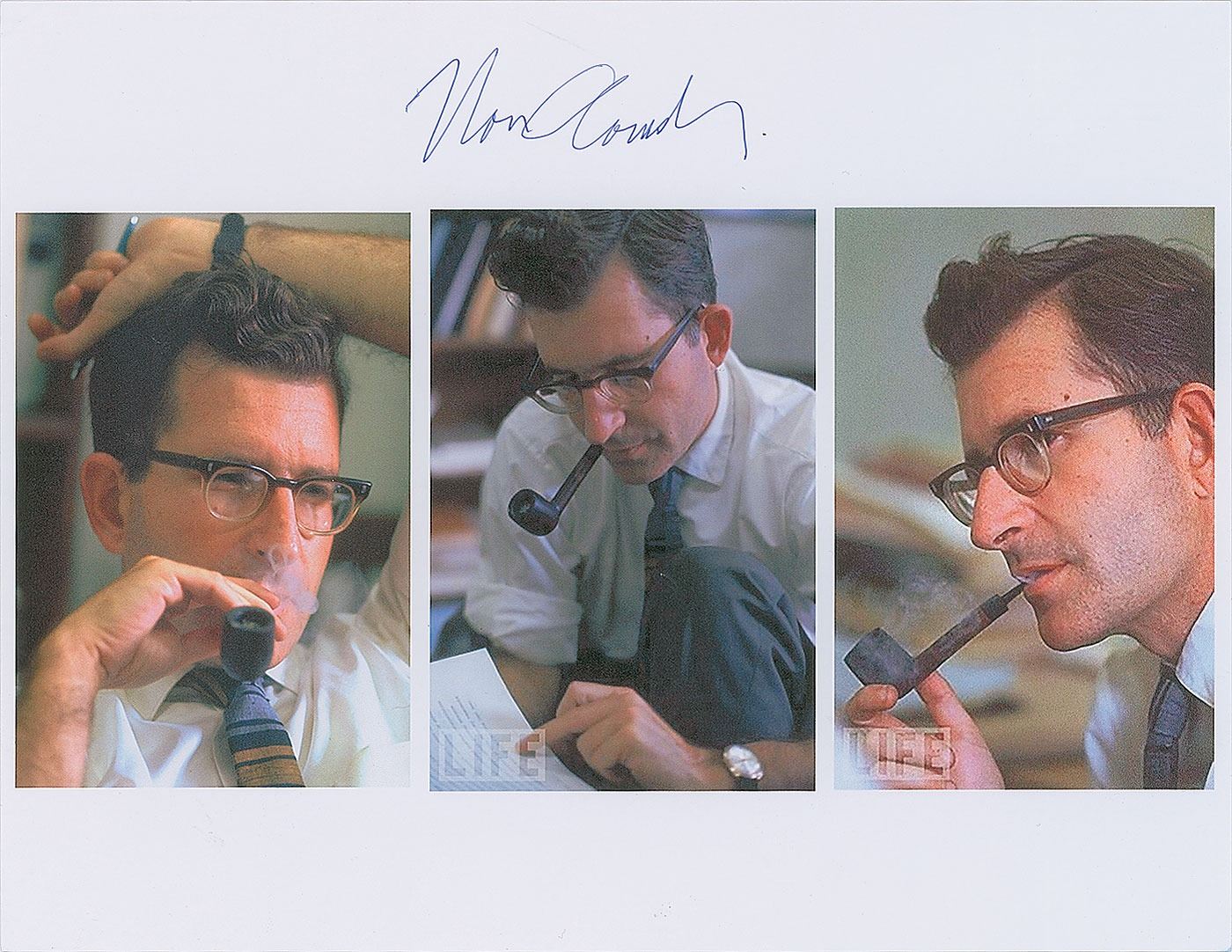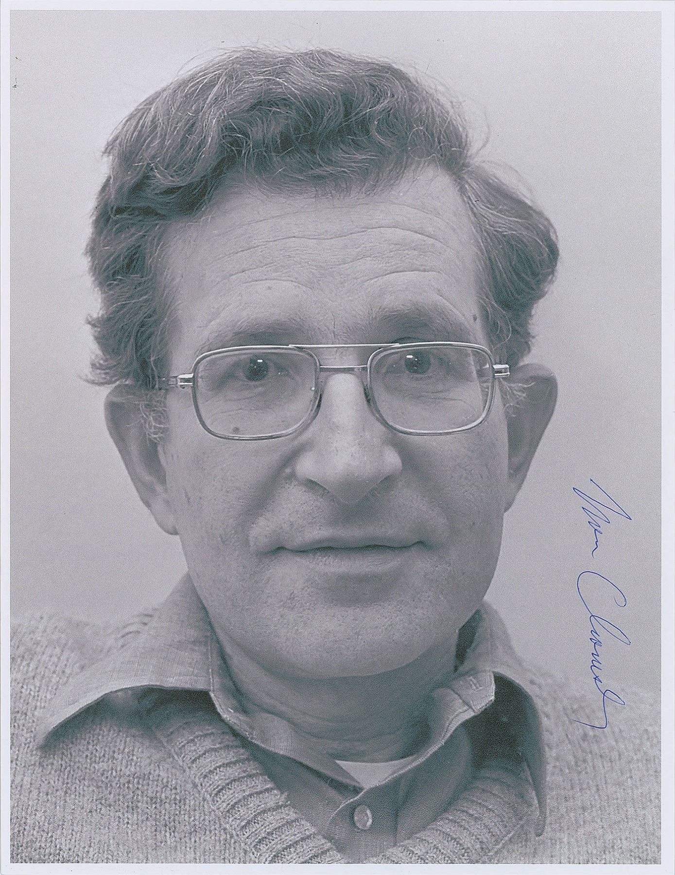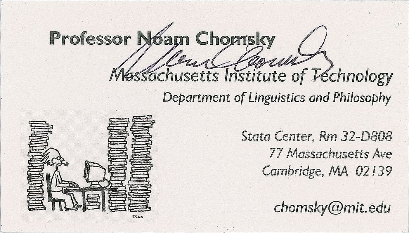 Four items: an MIT business card belong to Chomsky, 3.5 x 2, signed in black ballpoint; and three laserprint photos of the noted analytical philosopher, 8.5 x 11 and 11 x 8.5, each signed in blue ballpoint. In overall very fine condition.