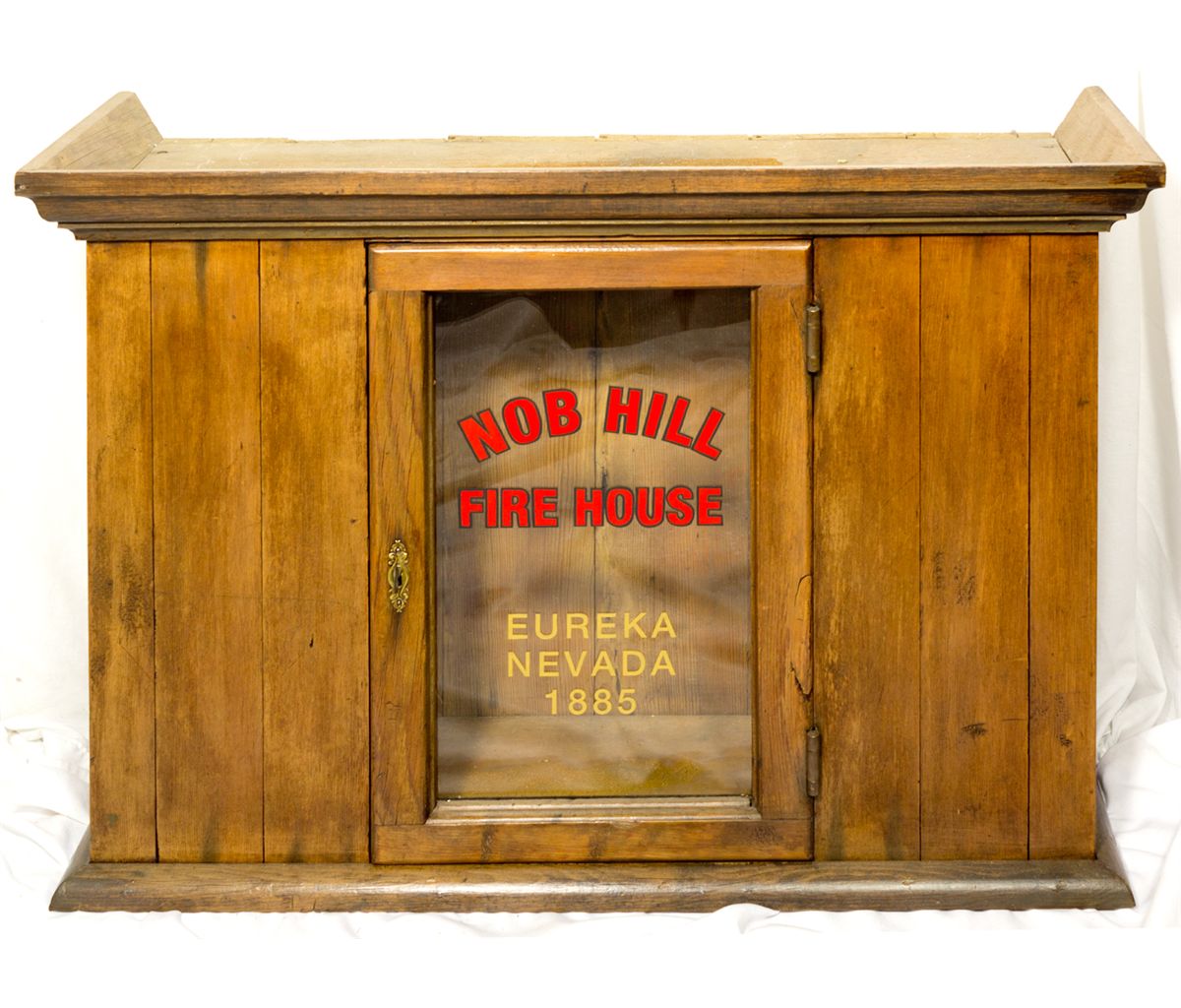 Connie Hicks, longtime resident and historian of Eureka, wrote that "The April 24, 1879 edition of the Eureka Sentinel newspaper reported that after the April 18, 1879 fire, there was a need for another fire company. The Nob Hill Volunteer Hose Company #5 was formed to serve the Nob Hill area." The Nob Hill Fire House served many functions in Eureka in addition to responding to fires in the city. Interestingly, "the New Year's Eve Masquerade Ball in Eureka was sponsored by the Nob Hill Firemen. It was the social event of the year and always filled the Opera House to capacity. Only those in costume were allowed on the main floor until unmasking at midnight, when winners were announced. The prizes were cash awards of $5, $10 and $15 which was very good money in those days. One year someone, dressed as a monkey, had everyone convinced the person under the costume was a very agile young man. The monkey climbed the poles from main floor to the balcony and actively entertained the crowd all evening. The unmasking proved it to be a lady dentist, Mabel Young, of Eureka" [Ref: Connie Hicks]. Eureka is still served by a volunteer fire brigade, though the Hose Company #5 ceased sometime in the 1950s. This exciting lot of Nevadan firefighter history includes: 1) A black enameled stove measuring 30" x 14" x 17". 2) A 33" x 12" x 24" wooden fire hose cabinet with "NOB HILL" painted in red on the glass front. 3) Documentation about the Nob Hill Volunteer Hose Company #5 including articles, notes, and other correspondence all written by Connie Hicks. 4) Three 3.5" x 5.5" postcards showing the Nob Hill firefighters and the station in Eureka. - Jacobitz Collection -60415