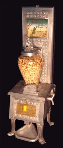 Nobbys Peanut Vendor, with original stand, has three dimensional Monkey marquee. Claw feet, one cent, coin operated, cir. 1920. Machine 13 X 35 X 16 inches/ Stand is 29 inches tall.