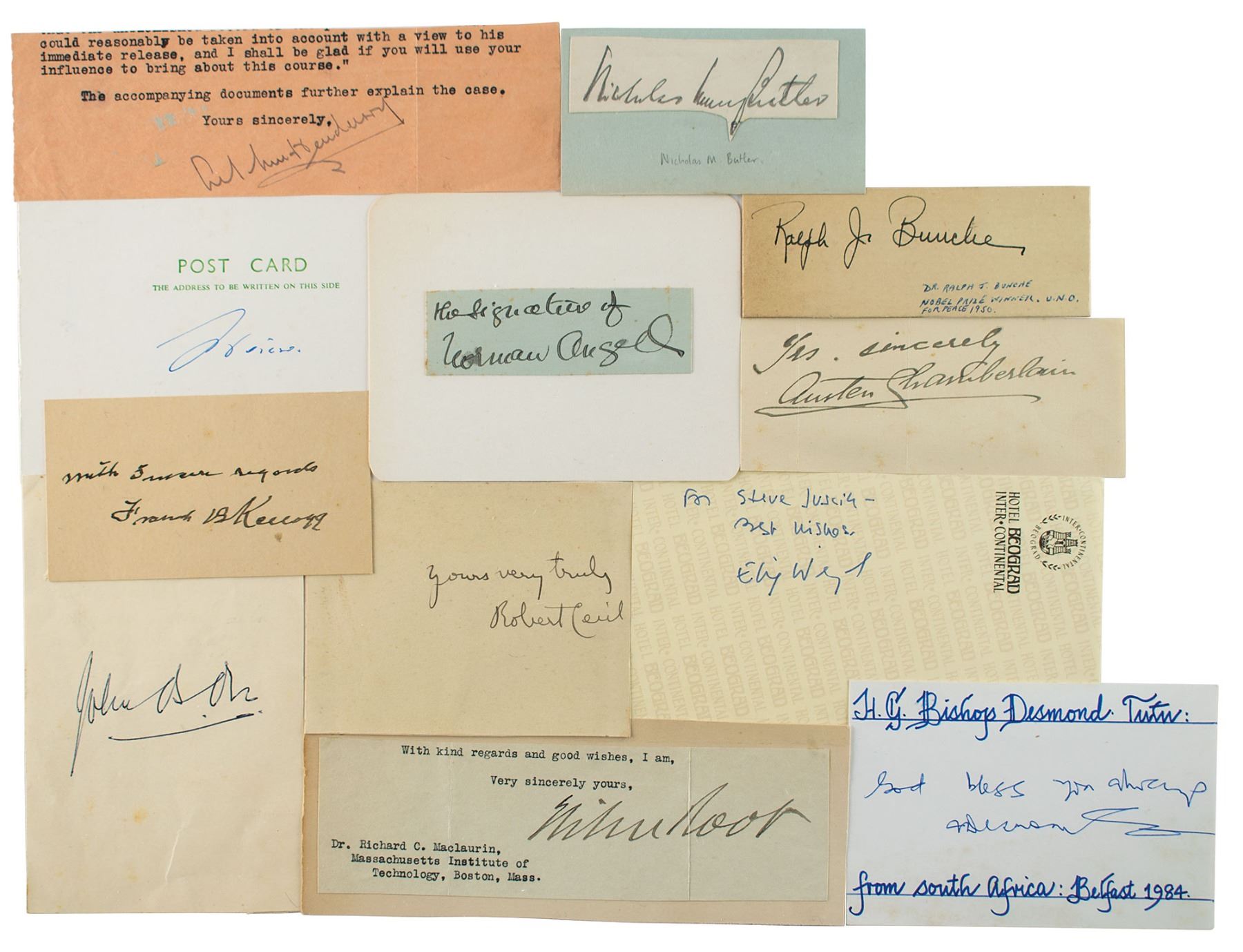 Twelve ink signatures of Nobel Peace Prize winners on slips and cards of various sizes, including: Elihu Root, Robert Cecil, Elie Wiesel, Frank Kellogg, Norman Angell, Arthur Henderson, Desmond Tutu, Austen Chamberlain, Ralph J. Bunche, Nicholas M. Butler, Lech Walesa, and John Boyd Orr. In overall fine condition, with irregular trimming to the Butler signature.