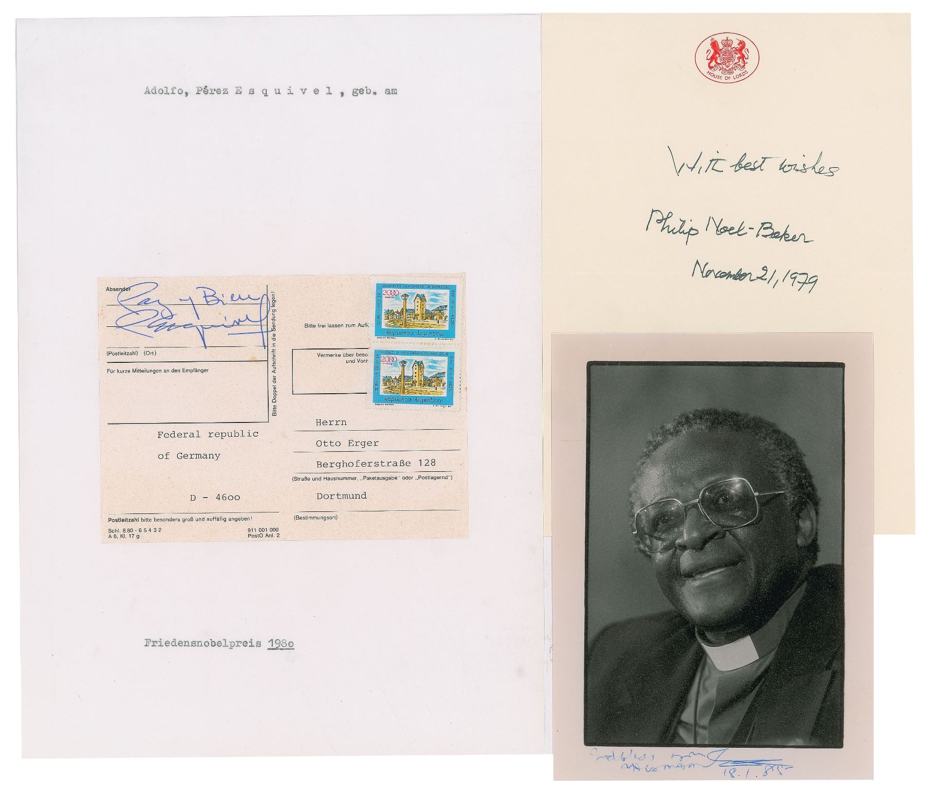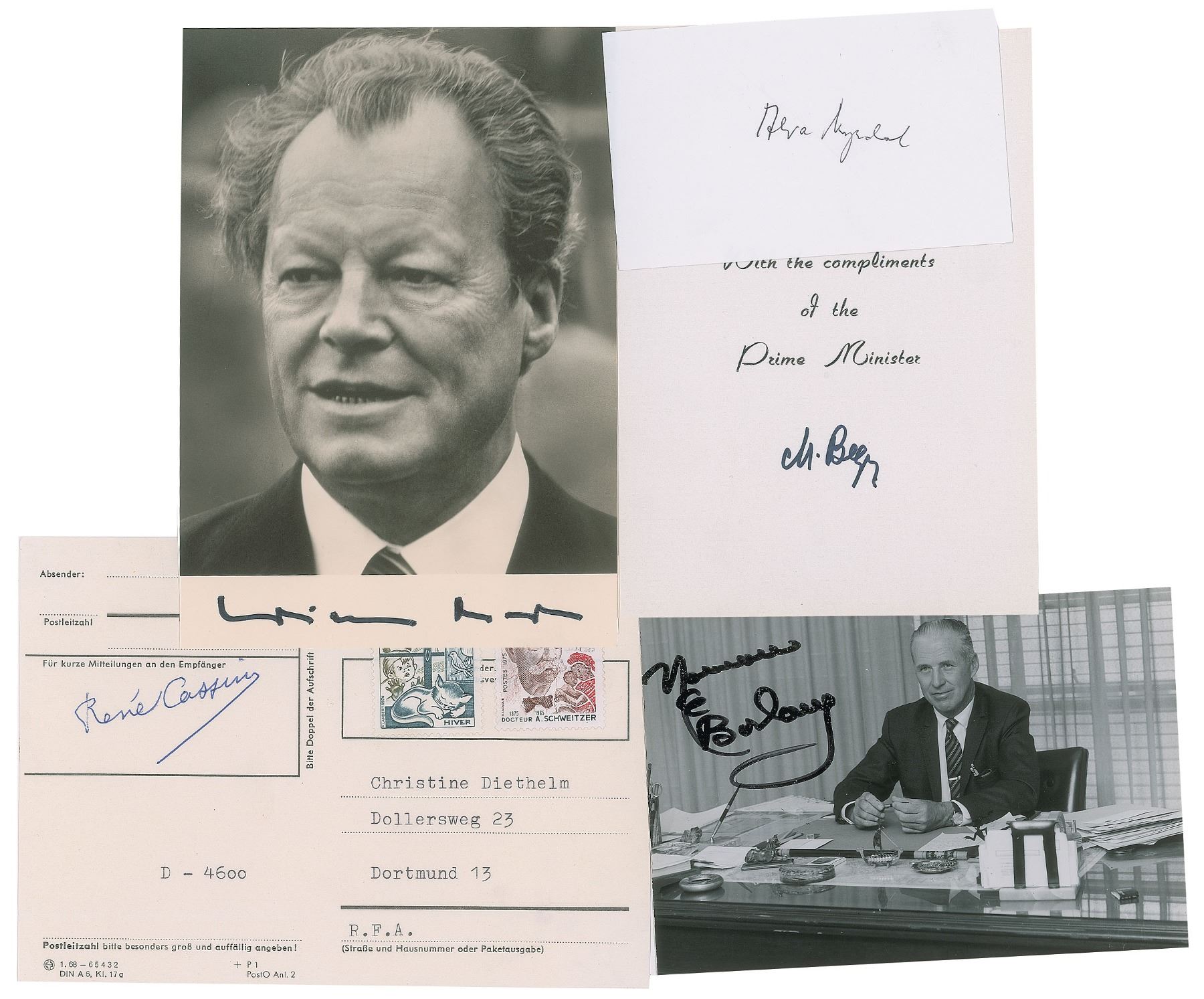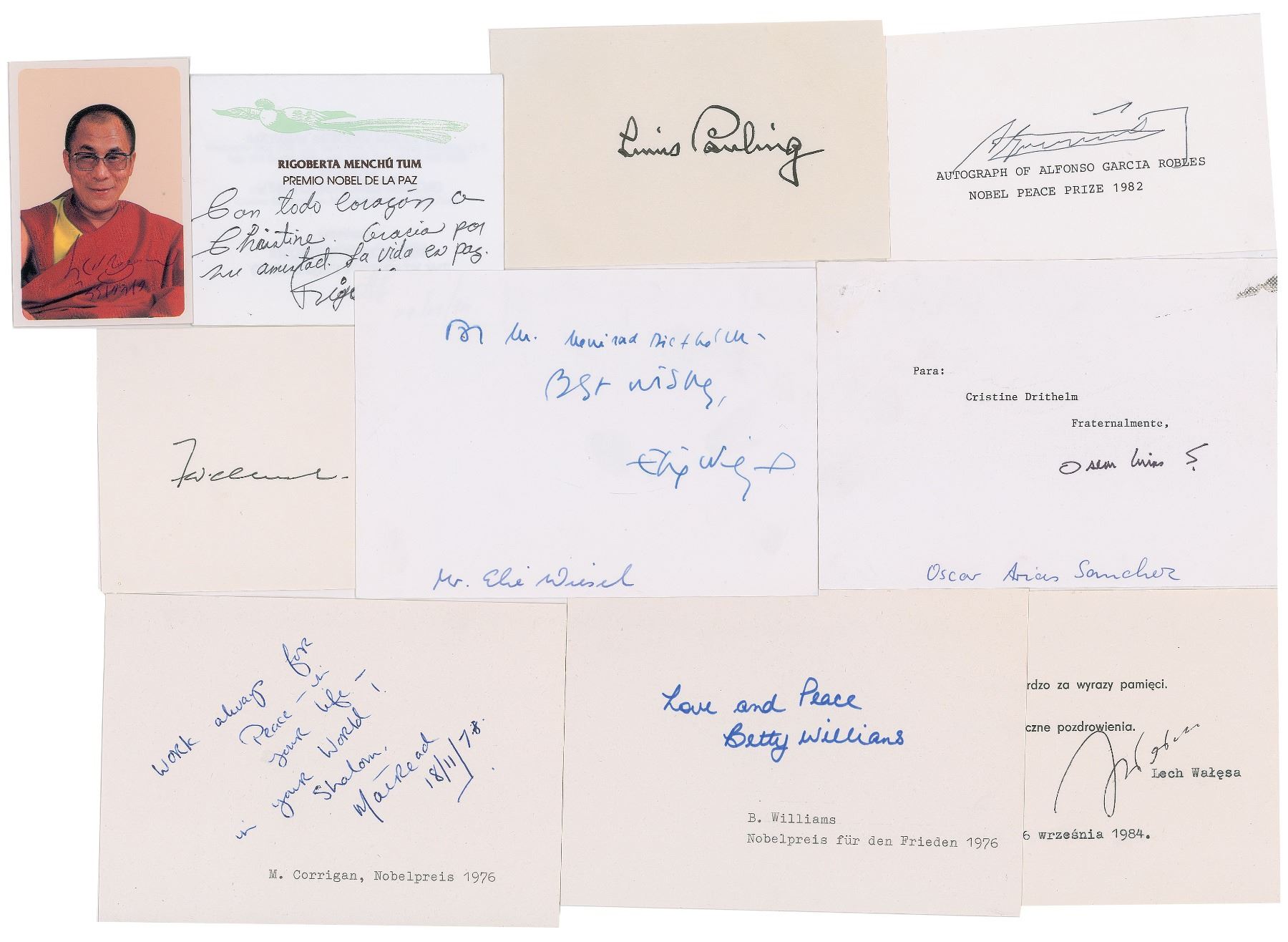 Collection of 18 items signed ink or felt tip by winners of the Nobel Peace Prize, the majority on cards or sheets, including: Oscar Arias, Menachem Begin (compliments card), Norman Borlaug (SP), Willy Brandt (SP), Rene Cassin (postal slip), Mairead Corrigan, Adolfo Perez Esquivel (postal slip affixed to a larger sheet), Dalai Lama (SP), Frederik Willem de Klerk, Rigoberta Menchu, Alva Myrdal, Philip Noel-Baker, Linus Pauling, Alfonso Garcia Robles, Desmond Tutu (SP), Lech Walesa (TQS), Elie Wiesel, and Betty Williams. In overall fine condition.