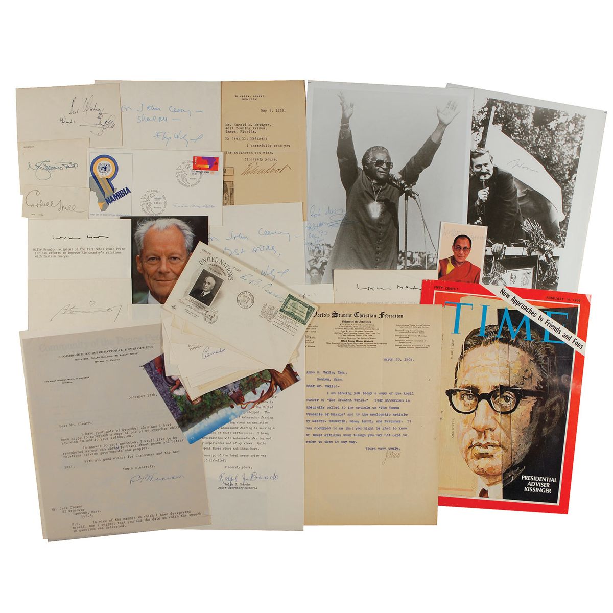 Fifty-two items consisting of FDCs, a magazine cover, letters, signatures, and signed photos from Nobel Peace Prize winners. Signers are: Dalai Lama, Mother Teresa (2), Mikhail Gorbachev, Willy Brandt (4), Henry Kissinger, J. R. Mott, Ralph J. Bunche (2), L. B. Pearson (2), Mairead Corrigan (3), Rigoberta Menchu Tum, Sean MacBride (3), Philip Noel-Baker, Linus Pauling, Norman Angell (2), Dominique Pire, Bernard Lown, Menachem Begin (2), Lech Walesa (5), Desmond Tutu (2), Adolfo Esquivel, Betty Williams (2), Rene Cassin, Boyd Orr, Norman Borlaug, Frank B. Kellogg, Shimon Peres, Cordell Hull, Elie Wiesel (2), George Marshall, Elihu Root, and three others. In fine condition, with scattered light creasing and toning.