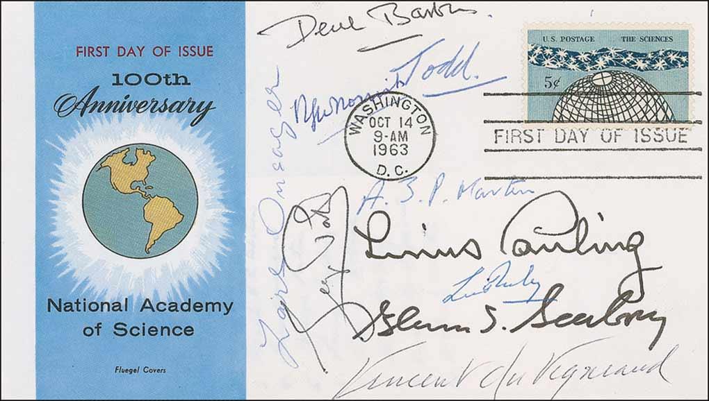 FDC with a cachet honoring the 100th anniversary of the National Academy of Science, signed on the front in various inks by nine Nobel Prize recipients including Barton, Todd, Porter, Pauling, Ruby, and Seaborg. In fine condition.