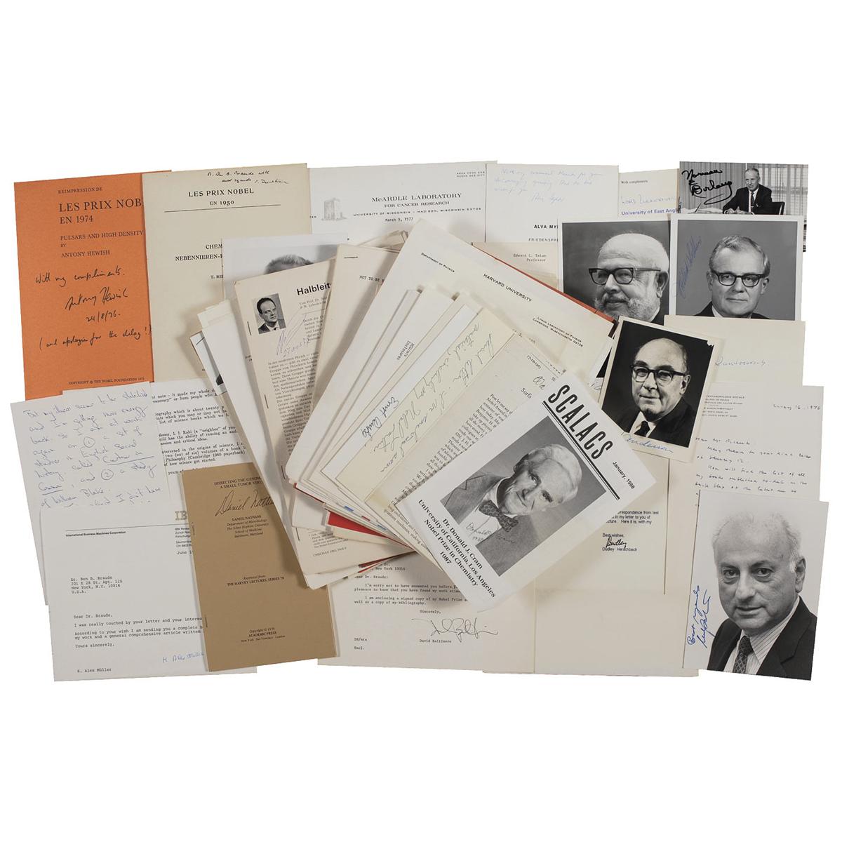 Unique group of approximately 100 items signed by various Nobel Prize winners including printed Nobel lectures, booklets, ALSs, TLSs, photos, signatures and envelopes. Signers include: Nikolaas Tinbergen, Hans Krebs, Ragnar Granit, John Kendrew, Harold Urey, Arthur Kornberg, W. F. Libby, Herbert Brown, Ernst Ruska, Haldan Hartline, Paul Flory, U. S. von Euler, William Fowler, Lord Zuckerman, Frederick Robbins, Thomas Weller, Edwin McMillan, Daniel Nathans, Isidor Rabi, Richard Rhodes, Howard Temin, William Giauque, Antony Hewish, Jean-Marie Lehn, R. B. Woodward, Andrew Schally, Milton Friedman, Werner Arber, Robert Holley, Dudley Herschbach, Leon Cooper, Norman Borlaug, Milton Friedman, A.M. Prochorov, Nicolai Basov, Donald Cram, Bernard Katz, Claude-Levi Strauss, E.T.S. Walton, Lawrence Klein, Franco Modigliano, Jan Oort, S. E. Luria, Aage Bohr, Georg Wittig, C. N. Yang, Theodore Schultz, M. F. Perutz, R. B. Woodward, Lord Zuckerman, Edward Tatum, Alva Mydral, William Fowler, Charles Huggins, Leon Lederman, Manfred Eigen, T. Reichstein, C.C. Ting, Rene Dubos, Julian Schwinger, Norman, Carl Anderson, Leonid Kantorovich, Werner Arber, Edward Thompson, Melvin Schwartz, Norman Burlang, Julius Axelrod, Godfrey Hounsfield, Herbert Simon, Steven Weinberg, Baruj Benaceraff, Dydket Gerscgbacgm, Arno Penzias, Walter Brattain, David Baltimore, Alex Muller, Alfonso Garcia Robles, Emilio Segre, and Robert Hofstadter. In fine overall condition.