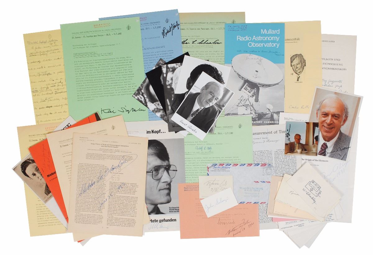 Impressive collection of sixty items, consisting primarily of photos, signatures, and articles, as well as a few letters, each signed by a winner of the Nobel Prize for Physics, including: Gerd Binnig (SP), Subrahmanyan Chandrasekhar (signature), Georges Charpak (SP and signature), Leon Cooper (signature), Johann Deisenhofer (SP), Leo Esaki (article), Val Logsdon Fitch (signature), William Fowler (booklet and signature), Ilya Frank (signature), Jerome Isaac Friedman (SP), Pierre-Gilles de Gennes (signature), Ivar Giaever (article), Donald A. Glaser (signature), Sheldon Lee Glashow (article), Werner Heisenberg (TNS), Robert Hofstadter (signature), J. Hans D. Jensen (signature), Brian Josephson (article), Henry Way Kendall (SP), Klaus von Klitzing (SP), Leon M. Lederman (signature), Simon van der Meer (signature), Rudolf Mossbauer (article), K. Alex Muller (SP), Arno Allan Penzias (article), Alexander Prokhorov (signature), James Rainwater (signature), Norman F. Ramsey, Jr. (article, signature, and envelope), Lord Rayleigh (signature), Burton Richter (signature), Heinrich Rohrer (SP), Carlo Rubbia (article and signature), Ernst Ruska (SP and booklet), Martin Ryle (booklet), Abdus Salam (SP), Arthur L. Schawlow (article and signature), Robert Schrieffer (article), Melvin Schwartz (SP and two signatures), Julian Schwinger (signature), Emilio G. Segre (signature), William Shockley (sketch), Kai Siegbahn (article), Jack Steinberger (ANS), Richard E. Taylor (SP), Samuel C. C. Ting (signature), Charles H. Townes (AMS), Ernest T. S. Walton (ANS and signature), Steven Weinberg (SP), Robert Wilson (signature), and Kenneth G. Wilson (signature). In overall fine condition. Accompanied by many of the original mailing envelopes.