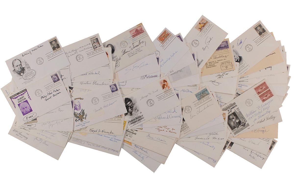 Collection of 75 FDCs, each signed in ink or felt tip by a Nobel Prize winner. Signers are Kenneth J. Arrow, Julius Axelrod, Philip Noel Baker, David Baltimore, Baruj Benacerraf, Nicolaas Bloembergen, Heinrich Boll, Renato Dulbecco, Ralph J. Bunche, Adolf Butenandt, Melvin Calvin, Rene Cassin, Owen Chamberlain, Carl F. Cori, Max Delbruck, Edward Doisy, Ernst O. Fischer, William A. Fowler, Milton Friedman, Karl von Frisch, William F. Giauque, Albert S. Gyorgyi, George Wald, Torsten Wiesel, Geoffrey Wilkinson, Haldan K. Hartline, Anthony Hewish, Robert Holley (2), Lawrence R. Klein, Robert Hofstadter, Charles Huggins, David H. Hubel, Andre Lwoff, Feodor Lynen, Fritz A. Lipmann, Simon Kuznets, Edwin M. McMillan, Sir Peter Brian Medawar, Barbara McClintock, Salvador Luria, Daniel Nathans, Robert Mulliken, Cesar Milstein, Czeslaw Milosz, Linus Pauling (3), Frederick Robbins, Ronald G. W. Norrish, Louis Neel, Edward M. Purcell, Arno Allan Penzias, Glenn T. Seaborg (2), Paul A. Samuelson (2), George D. Snell, Arthur L. Schawlow, Frederick Sanger, Carl Sagan, Isaac Bashevis Singer, Ronald Hoffman, John Bardeen & William Shockley, William Shockley, Henry Taube, Kenneth Wilson, Howard M. Temin, Robert W. Wilson (2), Sir George P. Thomson, James Tobin, Lord Alexander R. Todd, Roger W. Sperry, and Herbert A. Simon. Many have added their affiliated institution or category and year of their prize below their signature. In fine condition. The signers in this lot—who range from poets to physicists—represent the pinnacle of human achievement in the 20th century