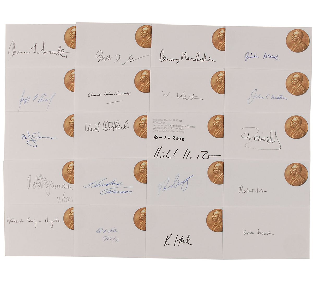 Twenty felt tip and ballpoint signatures on individual off-white 5 x 3 cards, each bearing an image of the Nobel Prize medal. Signers are: Mairead Corrigan, Brian David Josephson, Wolfgang Ketterle, Val Fitch, Claude Cohen-Tannoudji, Robert Huber, Phillip Allen Sharp, Robert Solow, Gunter Blobel, Dr. Barry Marshall, William Forsyth Sharpe, Vernon L. Smith, Dr. Joseph Stiglitz, Robert Aumann, Christopher Pissarides, Richard Ernst, Kurt Wuthrich, Aaron Ciechanover, John Mather, and Andre Geim. In overall very fine condition.