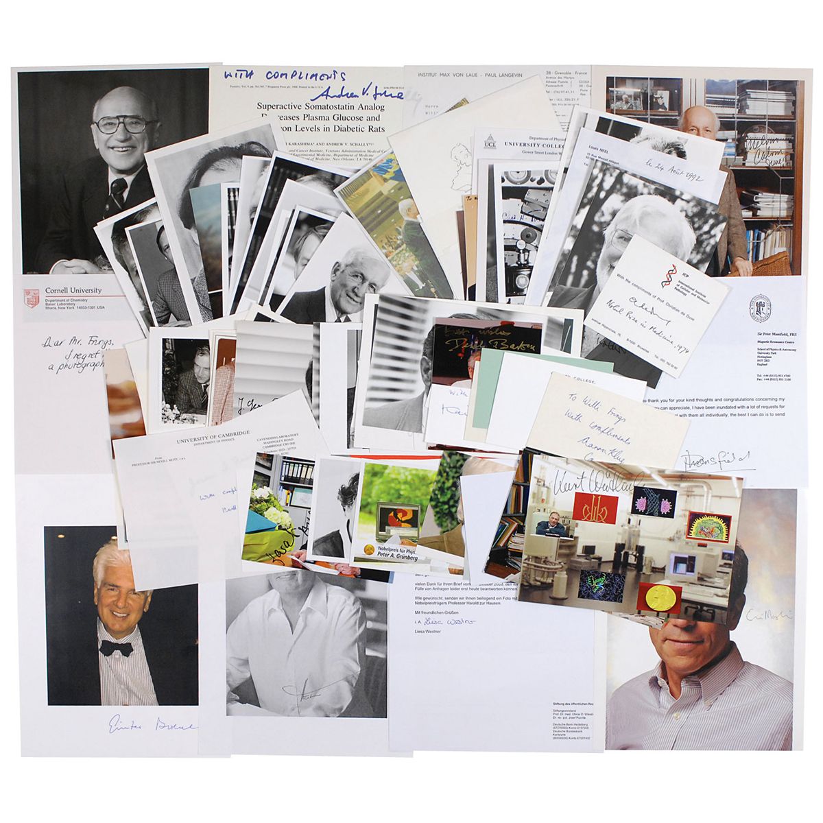 Collection of 108 items, consisting primarily of signed photos and signatures, with a few letters, printed articles, and other items mixed in, each signed by a former Nobel Prize winner. Signers include: Werner Arber, Julius Axelrod, D. H. R. Barton, J. Georg Bednorz, Melvin Calvin, Georges Charpak, Ronald Coase, Claude Cohen-Tannoudji, Jean Dausset, Christian de Duve, Gertrude Elion, Richard Ernst, Gerhard Ertl, Jerome Friedman, Kenichi Fukui, Pierre Gilles de Gennes (2), Peter A. Grunberg (2), Roger Guillemin (2), Herbert Hauptman, Antony Hewish, Roald Hoffmann (2), Gerardus Hooft, Godfrey N. Hounsfield, David Hubel (2), Bernard Katz, Aaron Klug, Jean Marie Lehn, Peter Mansfield, Rudolph A. Marcus, Eric Maskin, James Meade, Rudolf Moessbauer, Nevill Mott, K. Alex Muller (2), Louis Neel, D. E. Neher, George Olah, Linus Pauling, George Porter, Norman Ramsey, Tadeus Reichstein, Heinrich Rohrer, Carlo Rubbia, Paul A. Samuelson, Andrew Schall (2), Arthur I. Schawlow, Glenn Seaborg, Reinhard Selten, Kai Siegbahn, George D. Snell (2), Jack Steinberger, Richard Taylor, Howard Temin, Charles H. Townes, Torsten Wiessel, Carl Wieman, and Rosalyn Yalou. In fine condition. Some of the photos and signatures are accompanied by their original mailing envelopes.