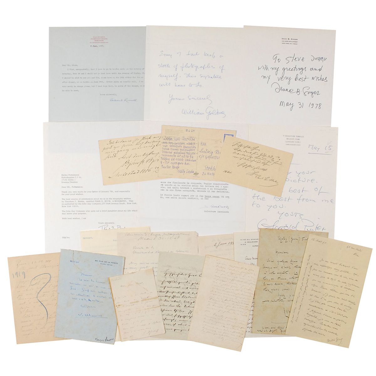 Wonderful collection of 20 letters, primarily consisting of ALSs, each by a recipient of the Nobel Prize for Literature, including: Nelly Sachs, Bjornstjerne Bjornson, Vincente Aleixandre, Sully Prudhomme, Selma Lagerlof (TLS), Carl Spitteler, Grazia Deledda, Pearl Buck (TLS), Salvatore Quasimodo (TLS), Andre Gide, Romain Rolland, Maurice Maeterlinck, Roger Martin du Gard, Rudolf Eucken, Frederic Mistral, William Golding, Harold Pinter, Isaac B. Singer, Francois Mauriac, and Bertrand Russell (TLS). In overall very good to fine condition. A wonderful collection of letters from this diverse range of acclaimed authors, with several unusual and highly scarce names.