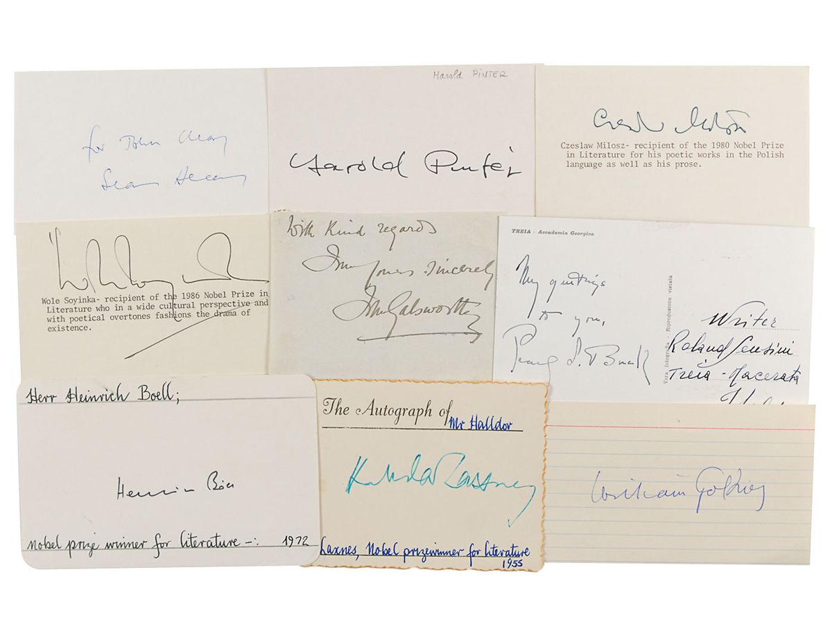 Collection of nine ink signatures of recipients of the Nobel Prize in Literature on individual cards and album pages, including: William Golding, Heinrich Boll, Halldor Laxness, Seamus Heaney, Harold Pinter, Czeslaw Milosz, Wole Soyinka, John Galsworthy, and Pearl S. Buck. In overall fine condition.