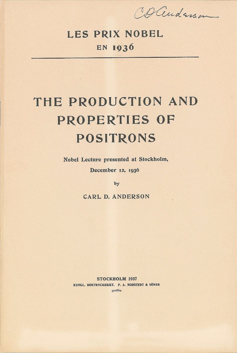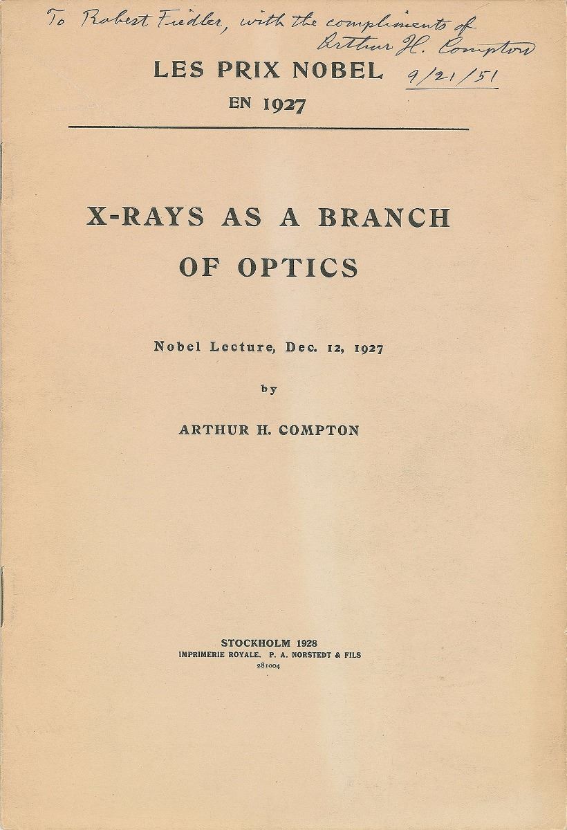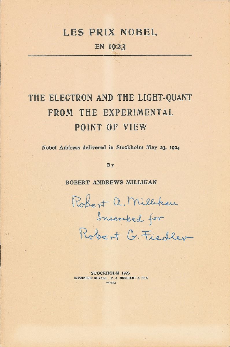 Fascinating lot of three booklets for Nobel Prize for Physics lectures, each 6.5 x 9.75, individually signed and inscribed on the front covers in blue or black ink by Robert Andrews Millikan, Arthur H. Compton, and Carl D. Anderson. Booklets include: Millikan’s 1924 address of “The Electron and the Light-Quant from the Experimental Point of View”; Compton’s 1927 address for “X-Rays as a Branch of Optics”; and Anderson’s 1936 lecture for “The Production and Properties of Positrons.” In overall fine condition, with some light toning to the covers.