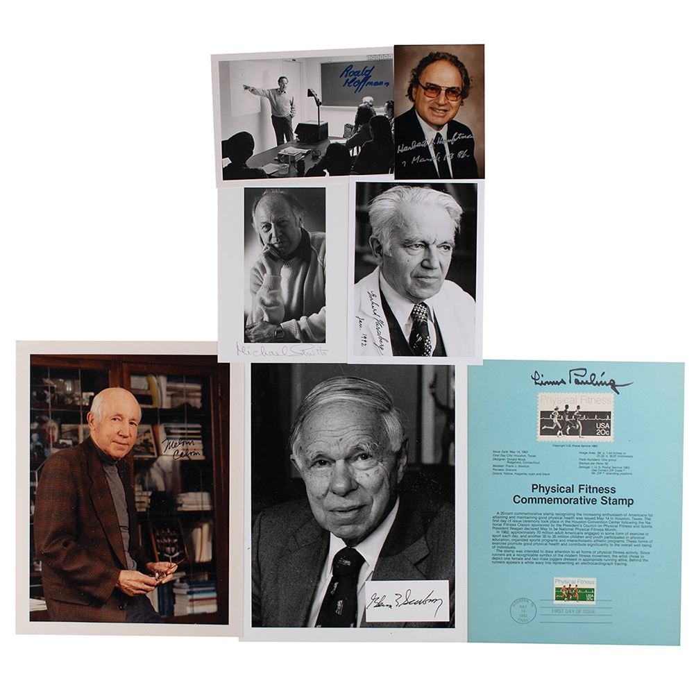 Group of seven items signed by winners of the Nobel Prize in Chemistry, including: Herbert A. Hauptman (SP), Roald Hoffmann (SP), Gerhard Herzberg (SP), Michael Smith (SP), Linus Pauling (stamp sheet), Glenn Seaborg (SP), and Melvin Calvin (SP). In overall fine condition.
