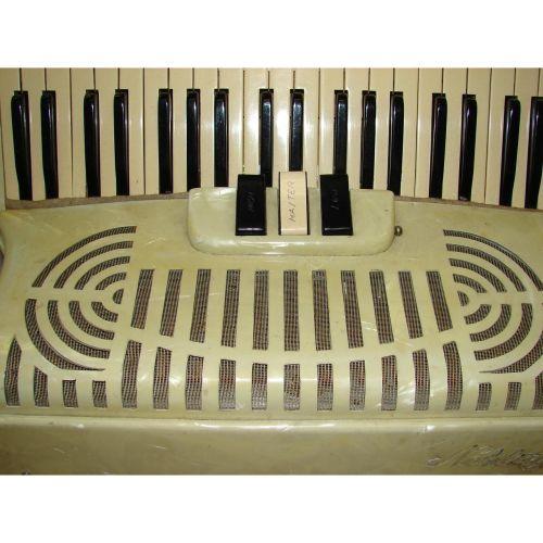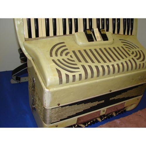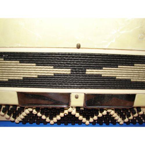 White case. 2/04 reeds. 2 bass shift, 3 voice, 120/41. Used shows wear. 16 1/2" keyboardx15 1/2"x71/2". comes with carrying case. Good Condition.