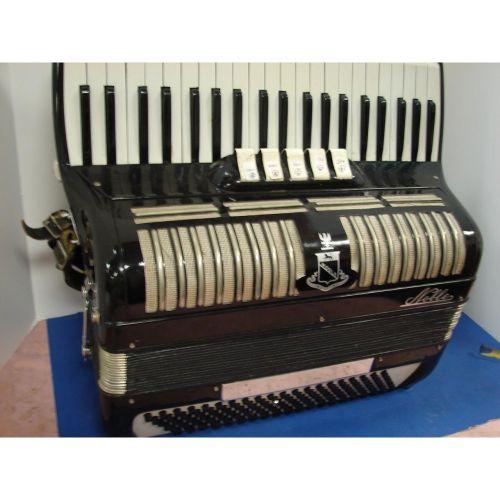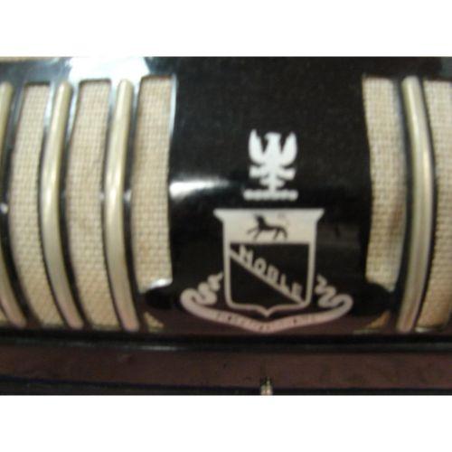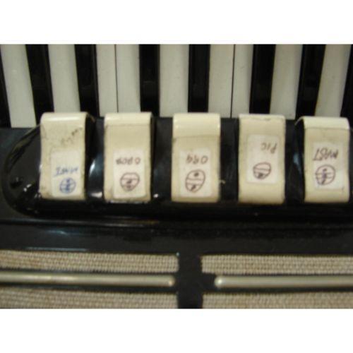 Black case with chrome trim. Comes with carrying case. 5 voice bass shift 120/41. 18" keyboard x 16x8". Good condition. Voice button has hand written labels.