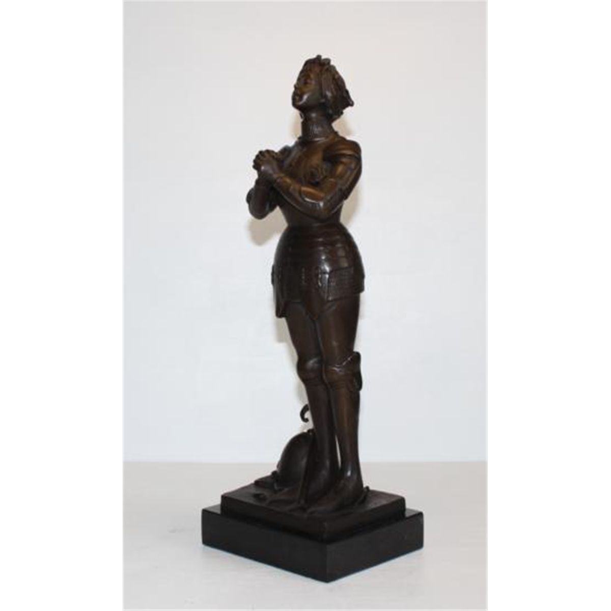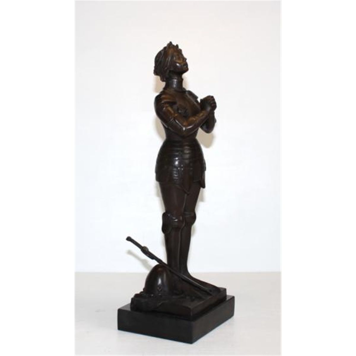 Joan of Arc, After Steiner, Bronze Sculpture, 16"H x 5 1/2"L x 5 1/2 D 14 lbs. This bronze sculpture was produced using the "Lost Wax" casting method. The"Lost Wax" Cast method is the most precise metal casting technique in existence, ensuring exquisite detail of the original host model which is usually sculpted in clay or wax. This "Lost Wax" casting method is an extremely labor intensive and expensive process, but the end results produce a Heirloom Quality Masterpiece!
