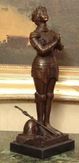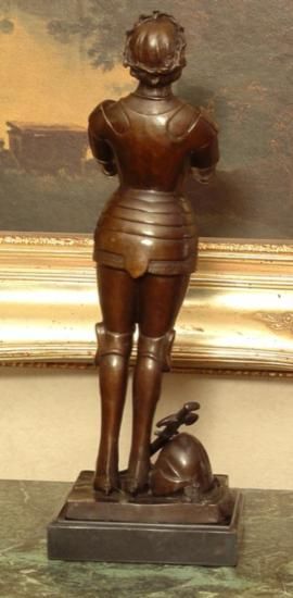 Joan of Arc, After Steiner, Bronze Sculpture, 16"H x 5 1/2"L x 5 1/2 D 14 lbs. This bronze sculpture was produced using the "Lost Wax" casting method. The"Lost Wax" Cast method is the most precise metal casting technique in existence, ensuring exquisite detail of the original host model which is usually sculpted in clay or wax. This "Lost Wax" casting method is an extremely labor intensive and expensive process, but the end results produce a Heirloom Quality Masterpiece!