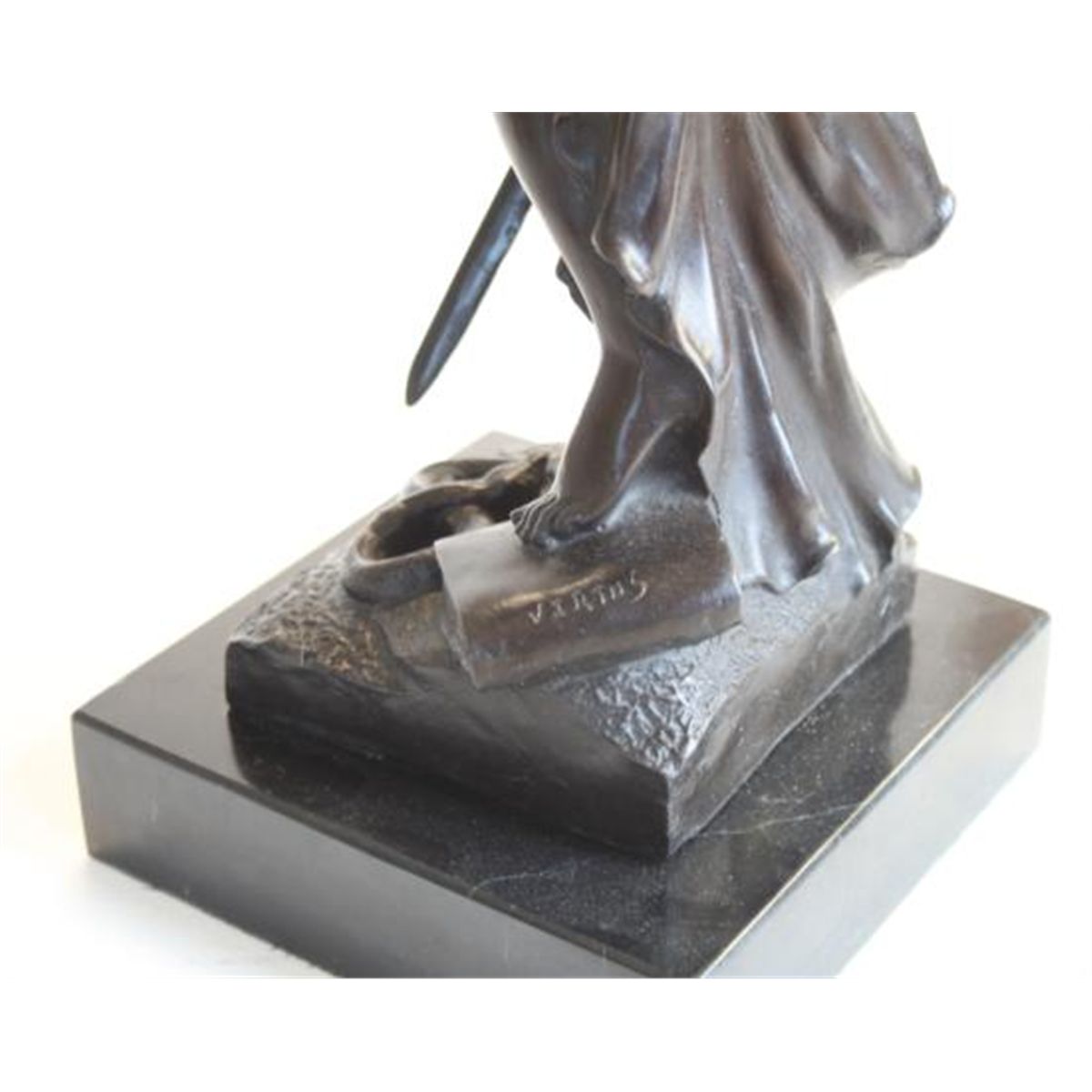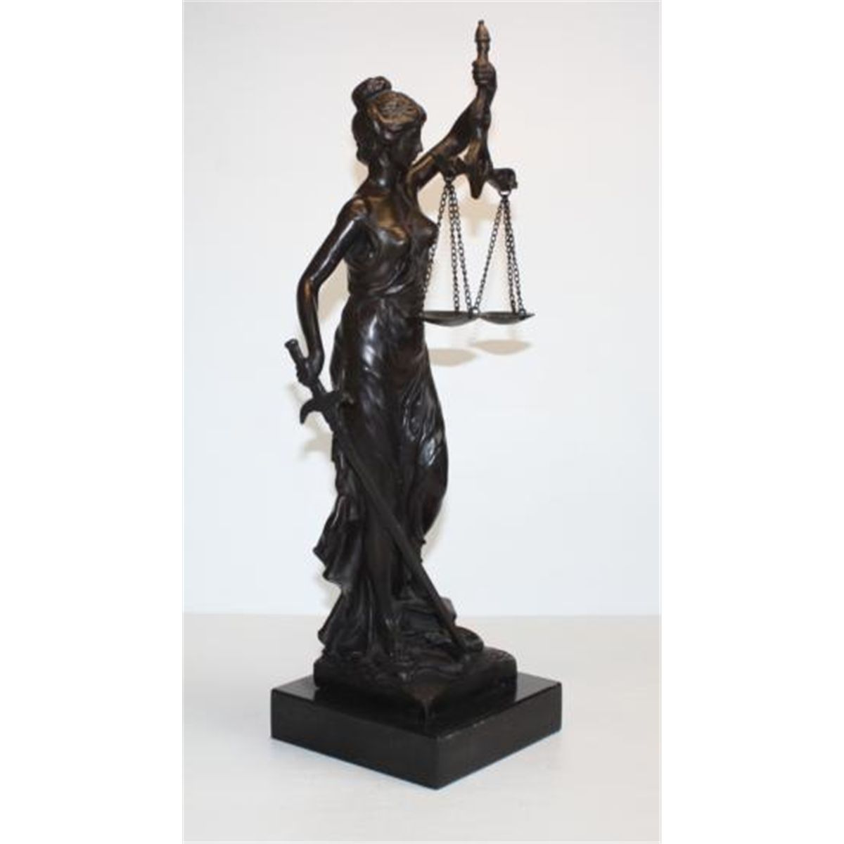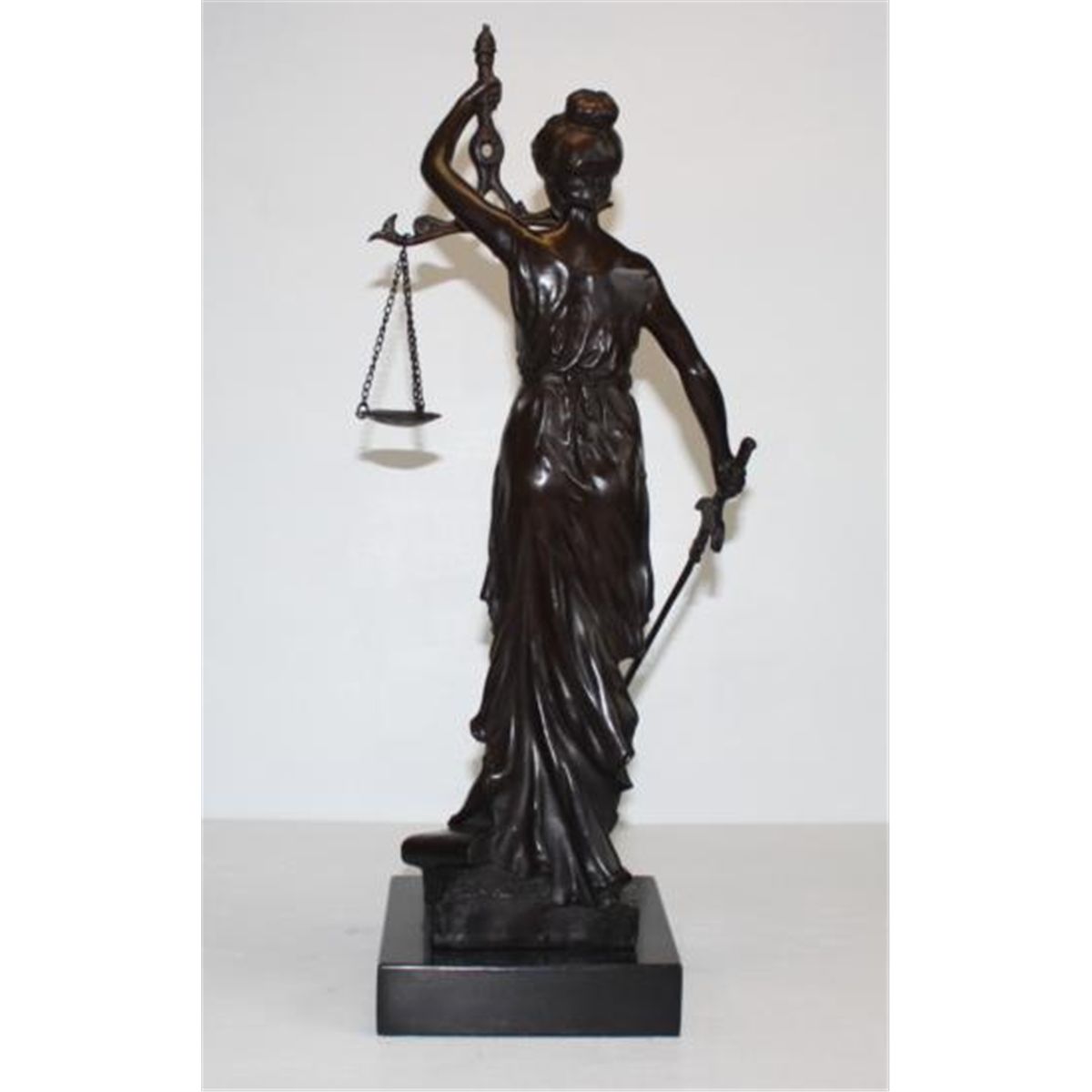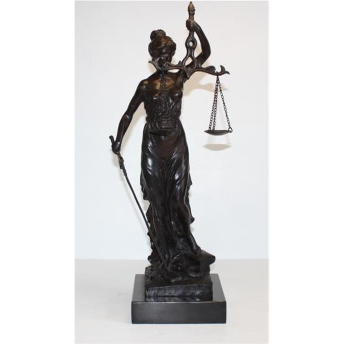 Lady Justice Bronze Sculpture, After Virtus, 20"H x 8"D x 7"W 18 lbs. This bronze sculpture was produced using the "Lost Wax" casting method. The"Lost Wax" Cast method is the most precise metal casting technique in existence, ensuring exquisite detail of the original host model which is usually sculpted in clay or wax. This "Lost Wax" casting method is an extremely labor intensive and expensive process, but the end results produce a Heirloom Quality Masterpiece!Lady Justice holding her scales and sword is a familiar icon of Law. Many images of her also include a blindfold.Goddess or lady, statues and paintings represent the spirit of Justice as a woman with the scales of justice in one hand and a sword in the other. She is often wearing a blindfold, to show her impartiality. The image probably has roots in the Greek goddess Themis and the Roman goddess Justia. Lady Justice paintings and statues are common in the Western legal world. Often - as in the state flag of Virginia and in the Department of Justice statue - she has one breast partly or completely exposed.But the image of this Goddess of Justice, left, bears no bindfold. Is this to remind us perhaps that justice is not blind at all?