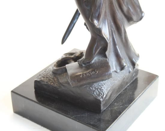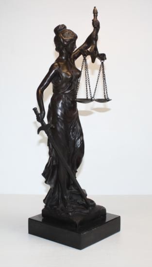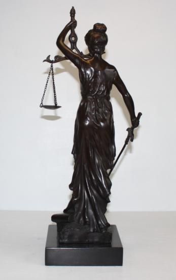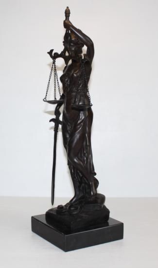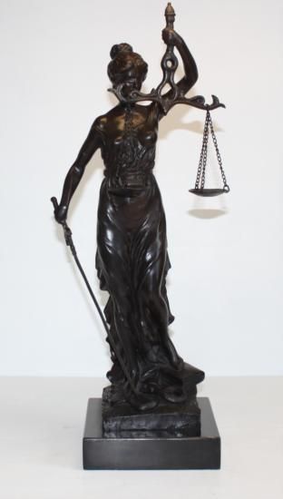 Lady Justice Bronze Sculpture, After Virtus, 20"H x 8"D x 7"W 18 lbs. This bronze sculpture was produced using the "Lost Wax" casting method. The"Lost Wax" Cast method is the most precise metal casting technique in existence, ensuring exquisite detail of the original host model which is usually sculpted in clay or wax. This "Lost Wax" casting method is an extremely labor intensive and expensive process, but the end results produce a Heirloom Quality Masterpiece!Lady Justice holding her scales and sword is a familiar icon of Law. Many images of her also include a blindfold.Goddess or lady, statues and paintings represent the spirit of Justice as a woman with the scales of justice in one hand and a sword in the other. She is often wearing a blindfold, to show her impartiality. The image probably has roots in the Greek goddess Themis and the Roman goddess Justia. Lady Justice paintings and statues are common in the Western legal world. Often - as in the state flag of Virginia and in the Department of Justice statue - she has one breast partly or completely exposed.But the image of this Goddess of Justice, left, bears no bindfold. Is this to remind us perhaps that justice is not blind at all?