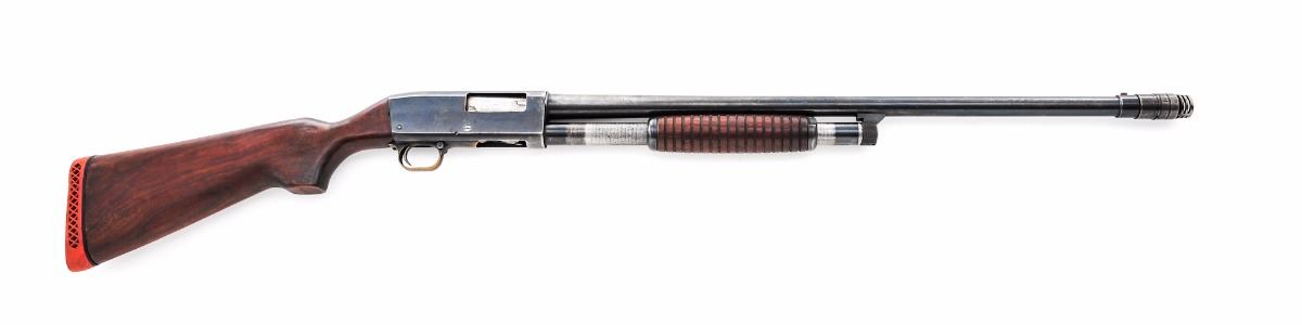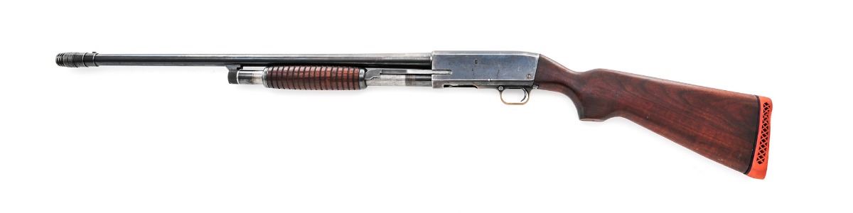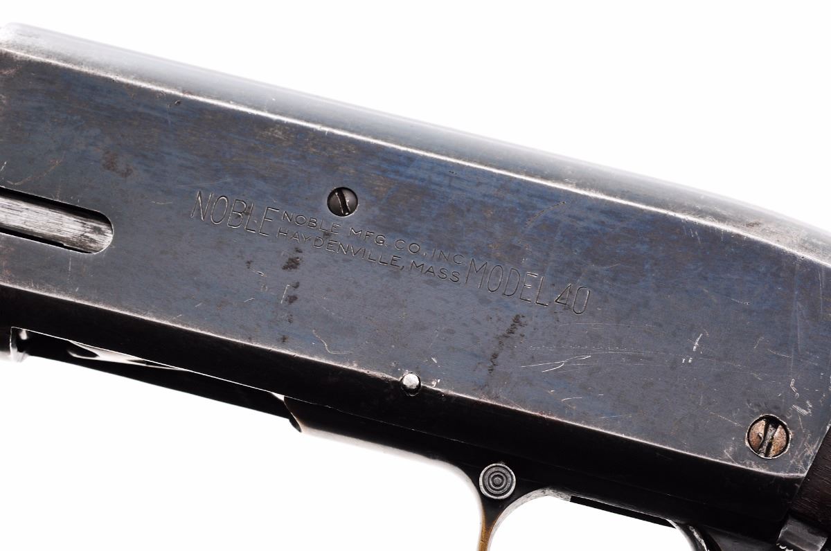 Noble Model 40 Pump Action Shotgun, NVSN, 12 ga. for 2-3/4'' shells, 28'' barrel including multi-choke, blue finish, replacement hardwood stock and grooved forend, with Sears red rubber recoil pad and brass bead front sight. Condition is good retaining approx. 50%-55% thinning blue with mild scratches and fine surface rust to barrel. Replacement stock does not fit flush to edge of receiver and shows some hand shaping. Action is crisp, bore is excellent. Est.: $125-$225. (C&R)