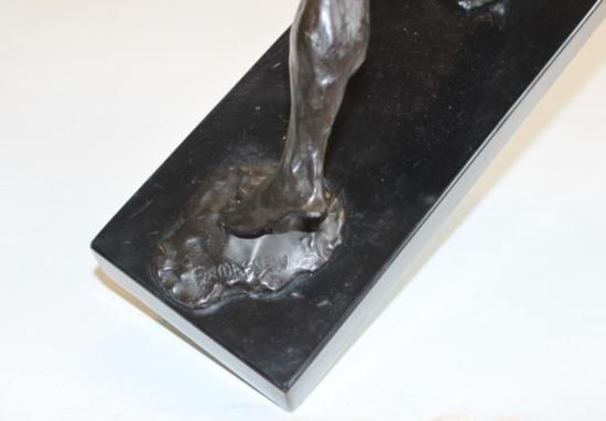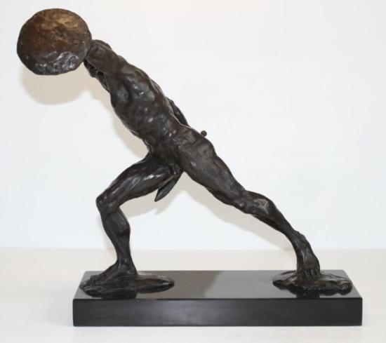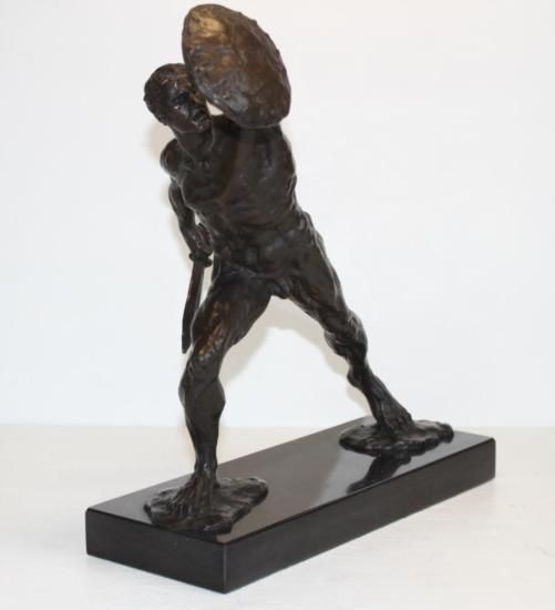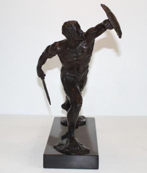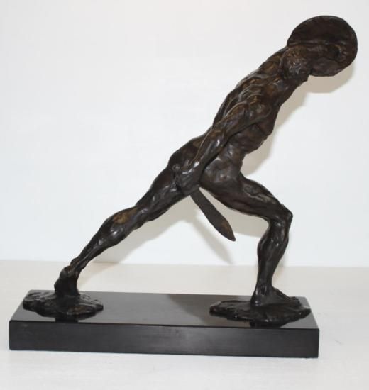 Noble Nude Gladiator with Sword and Shield, Bronze Sculpture, After Fix Masseau 14 1/2"H x 12 3/4"L x 4 3/4"D 18 lbs. This bronze sculpture was produced using the Lost Wax casting method. The Lost Wax Cast method is the most precise metal casting technique in existence, ensuring exquisite detail of the original host model which is usually sculpted in clay or wax. This Lost Wax casting method is an extremely labor intensive and expensive process, but the end results produce a Heirloom Quality Masterpiece!
