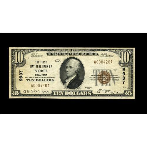 <B>Noble, OK</B></I> - $10 1929 Ty. 1 <B>The First NB</B></I> Ch. # 9937<BR>A very scarce note from the only issuer in this Cleveland County community. <B>Very Fine-Extremely Fine,</B></I> although sprinkled with more than a few pinholes.<BR><BR><b>Shipping:</b> Coin/Currency (<a target="_blank" href="http://www.heritageauctions.com/common/shipping.php">view shipping information</a>)