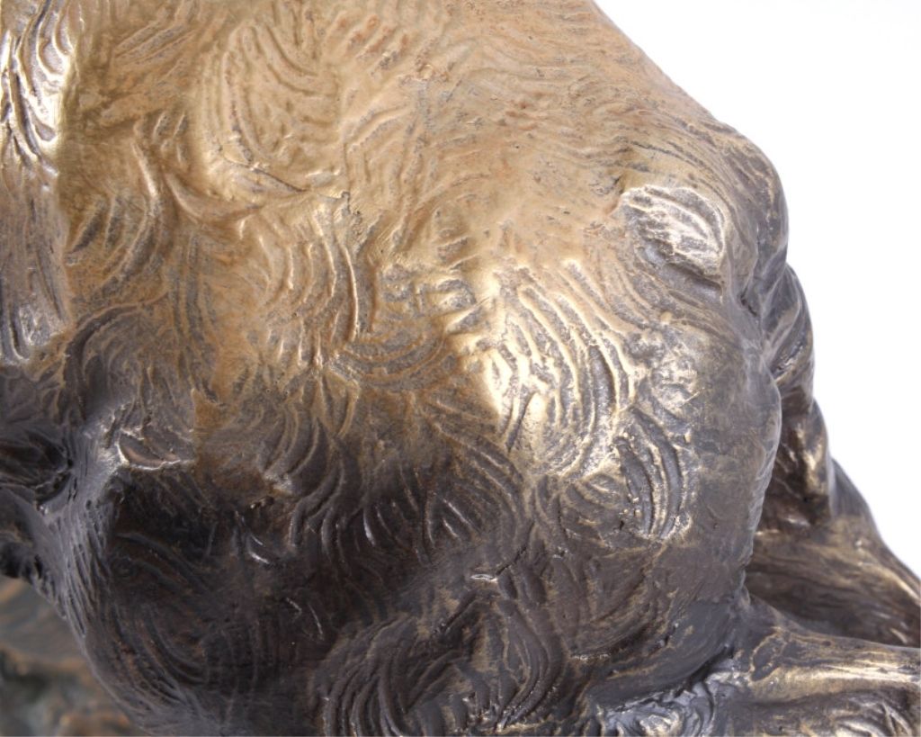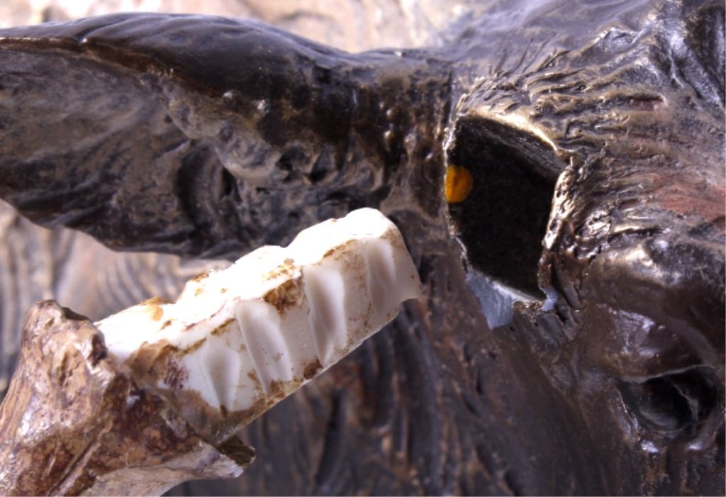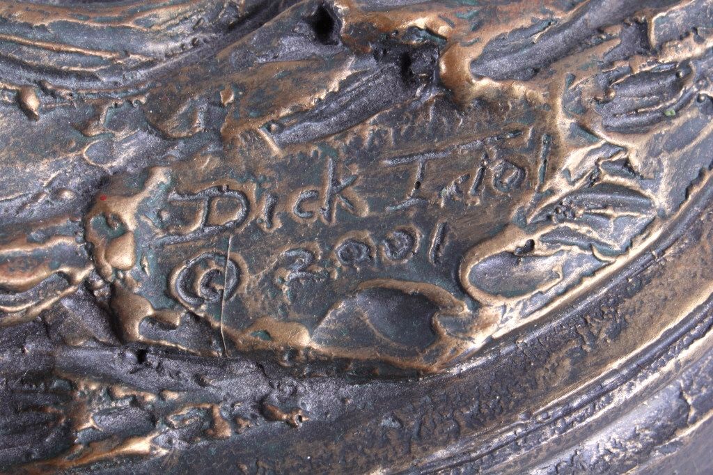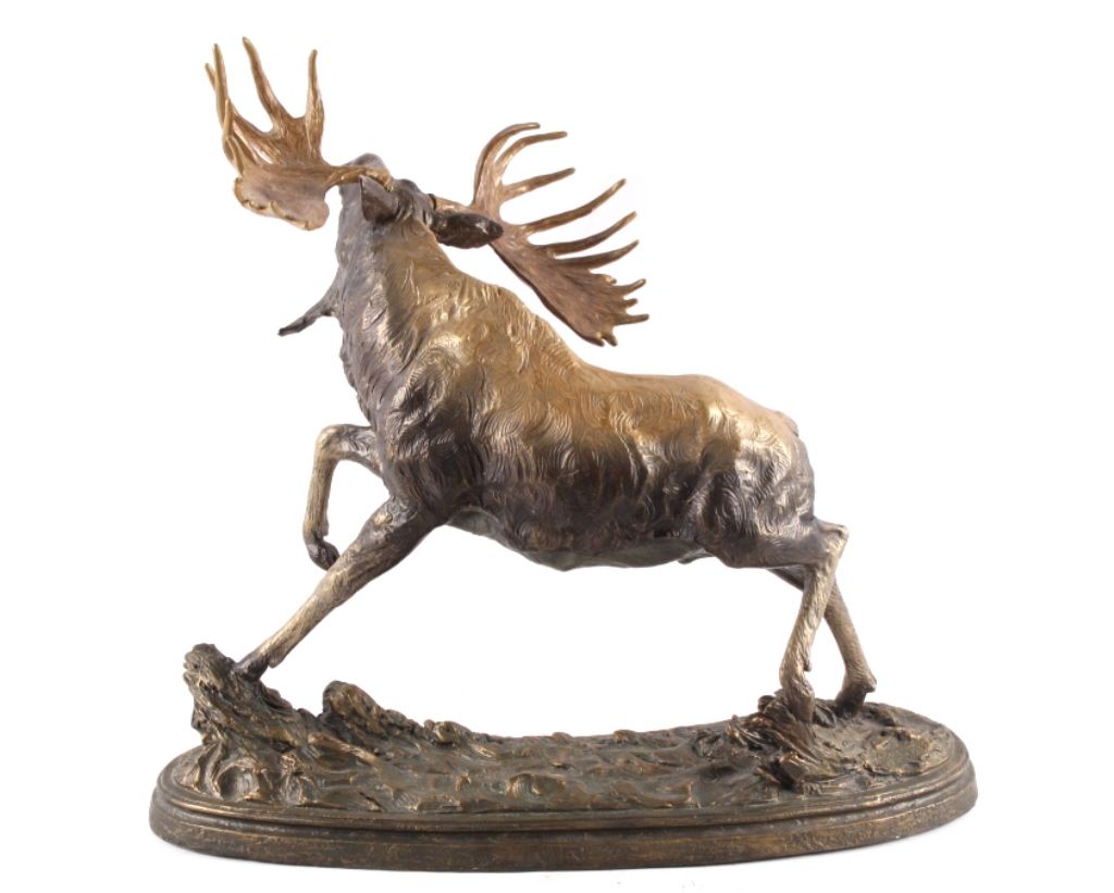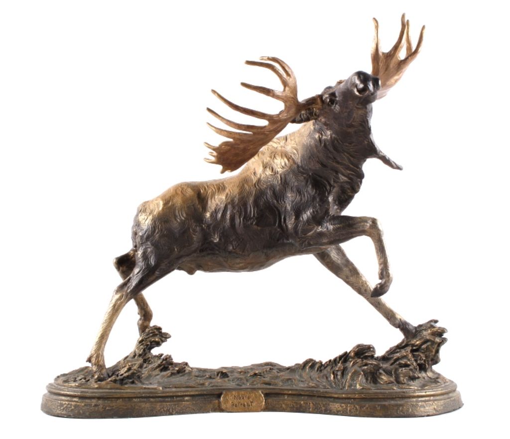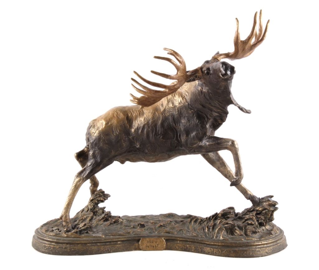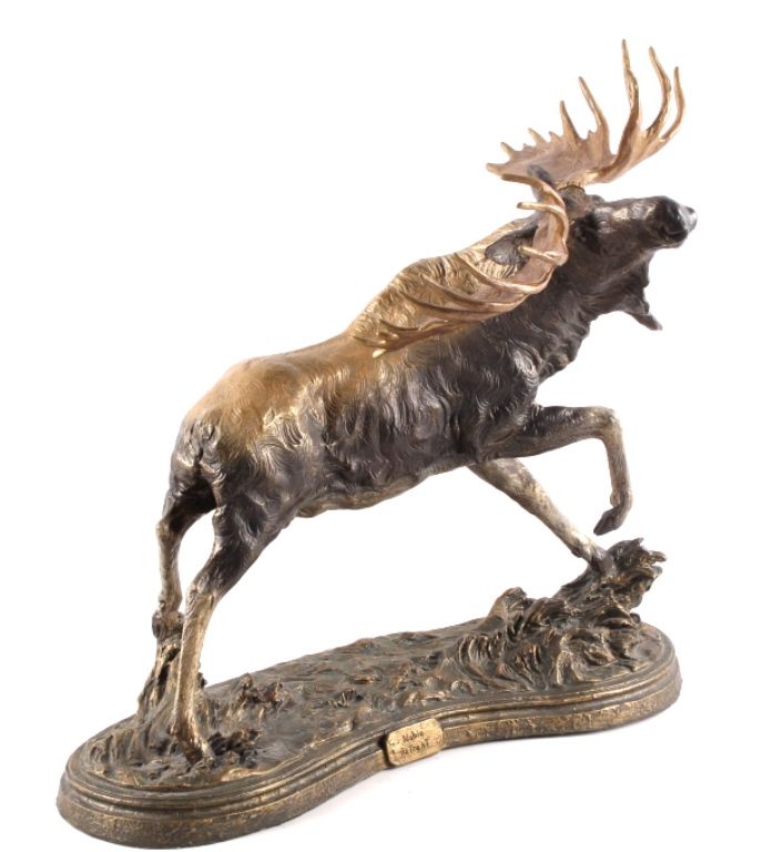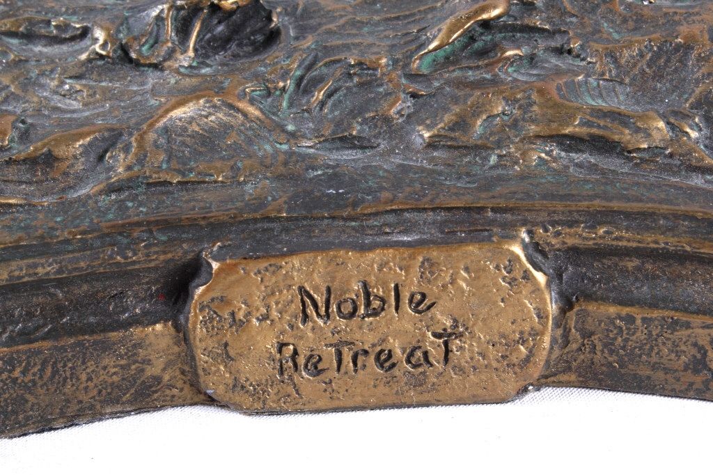 This is a work of art Moose Sculpture named, "Noble Retreat" by Dick Idol. The piece shows a bronze like finish and removable resin antlers. The sculpture has a very impressive design and great condition. This is a Big Sky Carvers Manhattan, Montana piece. Measures 22.25"l x 12"d x 21"t (with horn) 17.5"t (without horn). Weighs 25lbs.