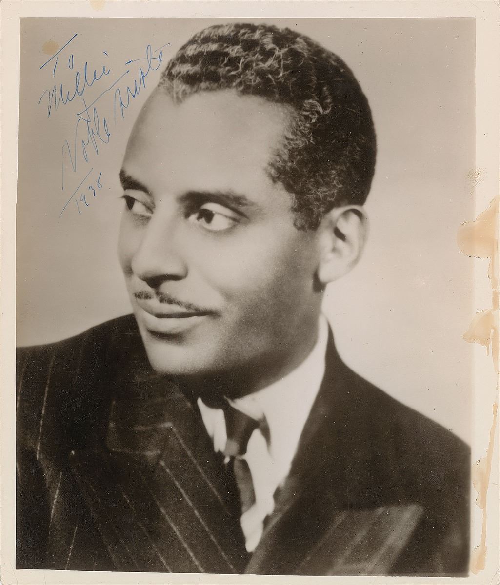 Jazz composer, bandleader, and playwright (1889–1975) best remembered for the Broadway musical Shuffle Along, and its hit song ‘I'm Just Wild About Harry.’ Uncommon vintage glossy 8 x 9.25 close-up photo of Sissle, signed and inscribed in blue fountain pen, “To Millie, Noble Sissle, 1938.” Reverse bears a William Morris Agency stamp. In fine condition, with trimmed edges, a small stain above the inscription, and staining to the right border which could be successfully matted out if desired. Consignor notes that her mother, Emily Grous Hollister, nicknamed ‘Millie,’ obtained the signature while working as a concierge to the stars at Hartford, Connecticut’s State Theatre during the late 1930s and early 1940s.