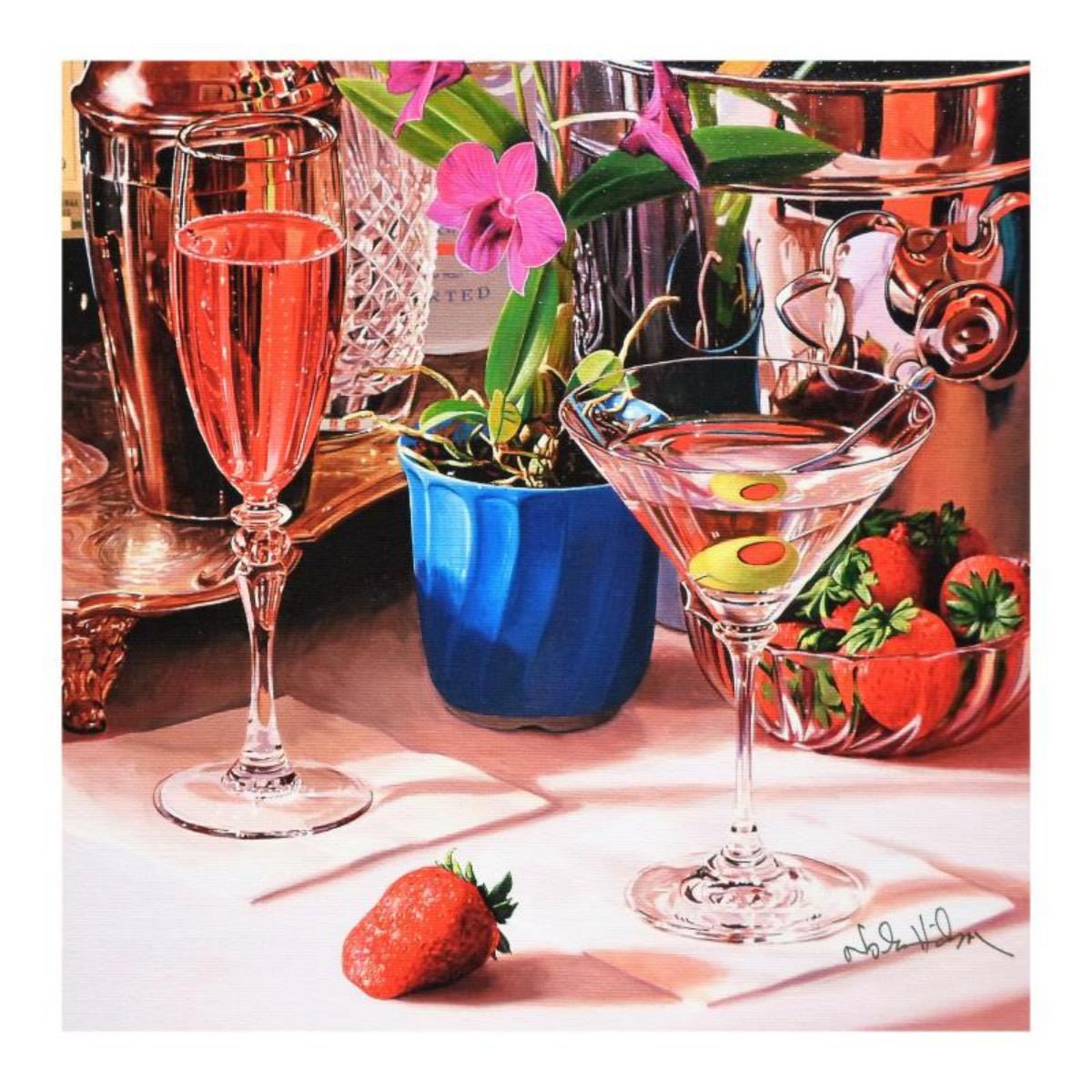 "Strawberries For Lunch" is a numbered limited edition giclee on canvas by Nobu Hairara. It comes bearing the artist's authorized signature and with a Certificate of Authenticity. Measures approximately 11.25"x11.25" (image). Reference #: 222524.