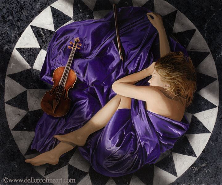Exhausted by a long rehearsal, she is lulled to sleep by her own "Nocturne" serenade. A 34x40" Ltd. Edition giclee on canvas. S/n by DELLORCO. Edition 150.