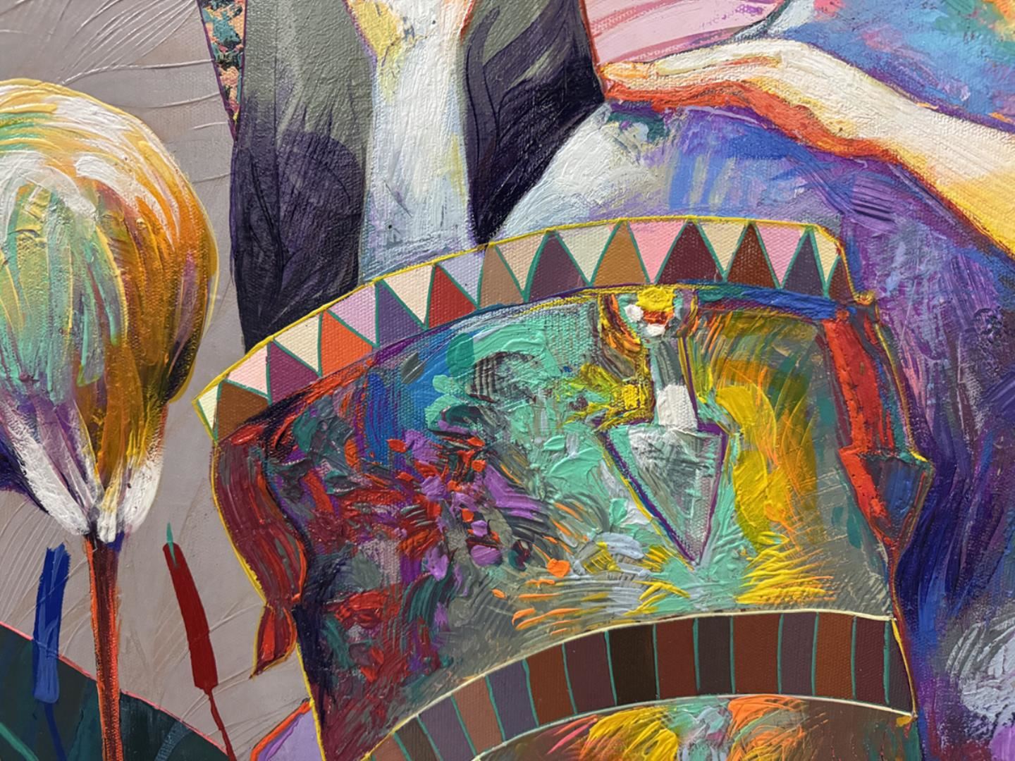 titled Nocturne of the Feathered Heart, is a breathtaking example of Tadeo Zavaleta's masterful artistry. The large scale of the piece 80x50" captures the intensity and drama of the moment, with dynamic movement and rich, vibrant colors that immediately draw the viewer in. Hand-signed by Zavaleta, this artwork comes framed with espresso wood floater.