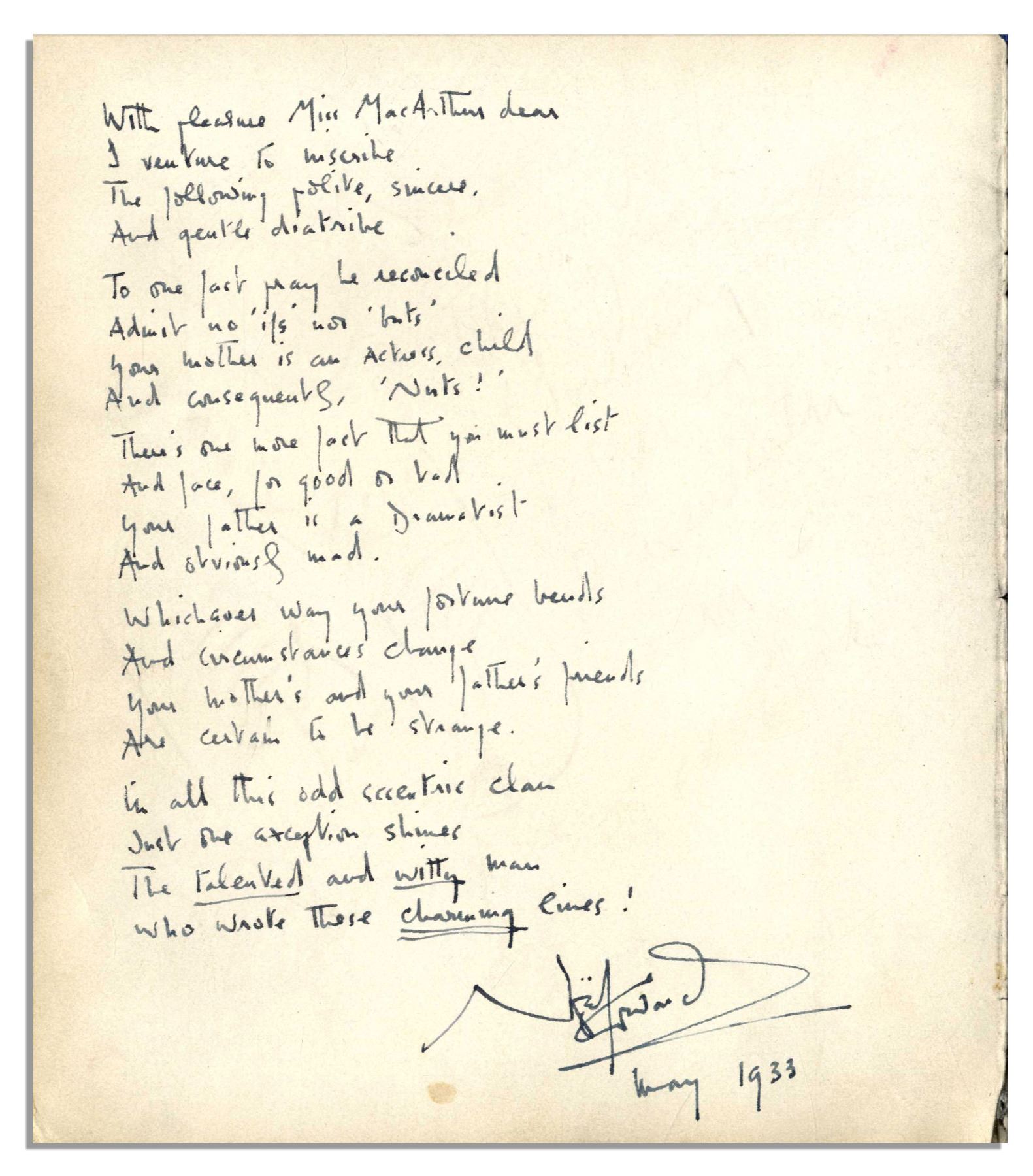 Original Noel Coward autograph poem signed. The playwright displays his legendary wit here in a poem for Mary MacArthur, young daughter of actress Helen Hayes. Handwritten poem reads in full ''With pleasure Miss MacArthur dear / I venture to inscribe / The following polite, sincere / And gentle diatribe / To one fact pray be reconciled / Admit no 'ifs' nor 'buts' / Your mother is an actress, child / And consequents, 'Nuts!' / There's one more fact that you must list / And face, for good or bad / Your father is a Dramatist / And obviously mad / And circumstances change / Your mother's and your father's friends / Are certain to be strange / In all this odd eccentric clan / Just one exception shines / The talented and witty man / Who wrote these charming lines! / Noel Coward / May 33''. On blank book page measuring 7'' x 8.25''. Light foxing, else near fine.