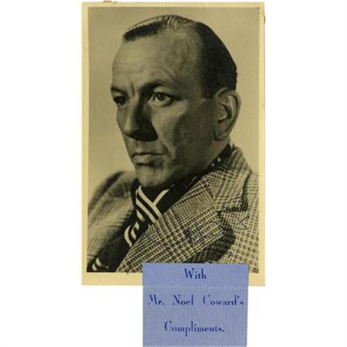 <B>Noel Coward Signed Photograph.</B></I> A 3.5" x 5.5" b&w photograph of Noel Coward, signed by him in blue ballpoint and dated 1943, the year Coward's play <I>Blithe Spirit</B></I> closed after 657 performances. In Very Fine condition with moderate age-toning and glue residue en verso (not affecting signature). Accompanied by a personalized sentiment, "With Mr. Noel Coward's Compliments," attached to base of photo.<BR><BR><b>Shipping:</b> Flat Material, Small (<a target="_blank" href="http://www.heritageauctions.com/common/shipping.php">view shipping information</a>)