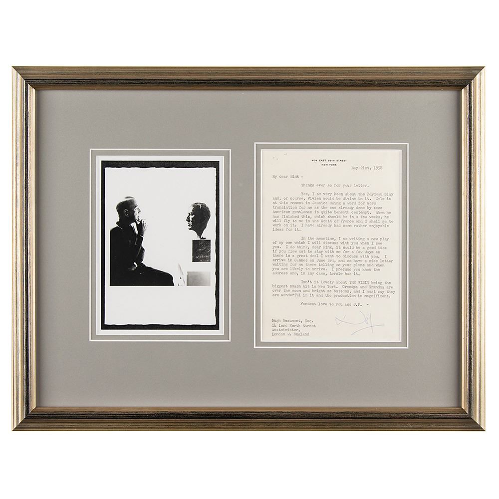 TLS signed “Noel,†one page, 5.25 x 7.25, 404 East 55th Street letterhead, May 21, 1958. Letter to impresario Hugh Beaumont, in part: "Yes, I am very keen about the Feydeau play and, of course, Vivien would be divine in it. Cole is at this moment in Jamaica doing a word or word translation for me as the one already done by some American gentleman is quite beneath contempt…In the meantime, I am writing a new play of my own which I will discuss with you when I see you. I do think, dear Bink, it would be a good idea if you flew out to stay with me for a few days as there is a great deal I want to discuss with you…Isn't it lovely about THE VISIT being the biggest smash hit in New York. Grandpa and Grandma are over the moon and bright as buttons, and I must say they are wonderful in it and the production is magnificent." Archivally double-matted and framed with a photo to an overall size of 18 x 14. In fine condition, with staple holes to the upper left corner.