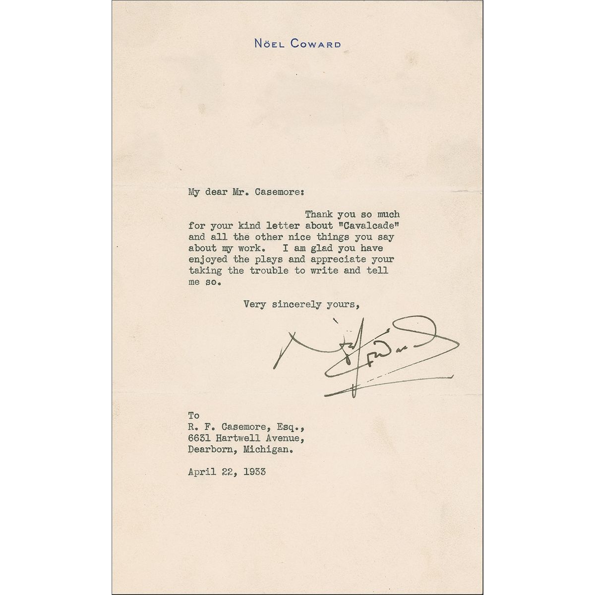 TLS, one page, 5.5 x 9, personal letterhead, April 22, 1933. In a letter to R. F. Casemore, Coward writes in full: “Thank you so much for your kind letter about ‘Cavalcade’ and all the other nice things you say about my work. I am glad you have enjoyed the plays and appreciate your taking the trouble to write and tell me so.” In very good condition, with light creasing, a uniform shade of toning, a few trivial spots of soiling, two small separations, show-through from remnants on the reverse, and one of the mailing folds passing through the very bottom of the “L” in the signature.