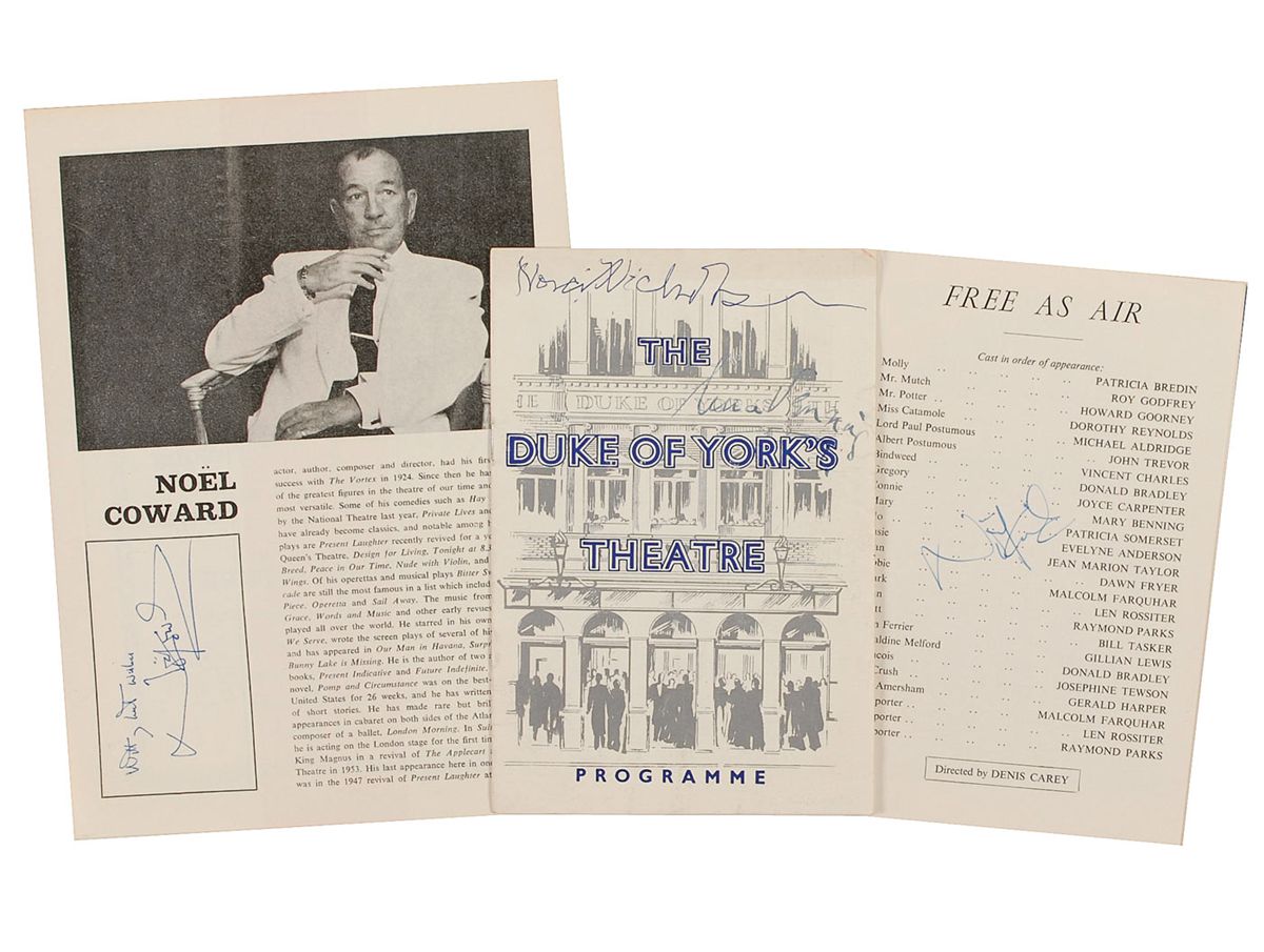 Three vintage programs: Waiting in the Wings, Free as Air, and A Song at Twilight, each signed in blue ink by Coward, the first singed on the cover, the second, on the cast page, and the third on Coward’s personal page. Light toning and creasing, otherwise fine condition.