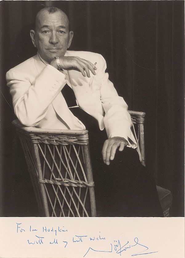 Vintage matte-finish 5 x 7 photo of a seated Coward holding a cigarette, signed and inscribed in the lower border in blue ballpoint “For Ian Hodgkins, with all my best wishes, Noel Coward.” In fine condition, with a few light surface marks and a hint of trivial silvering.